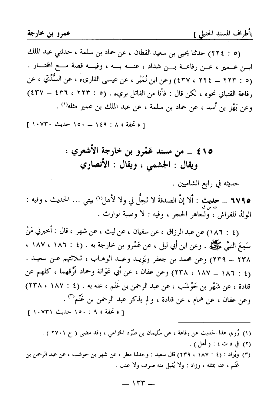 6795 -[ت س ق] حديث: ألا إن الصدقة لا تحل لي ولا لأهل بيتي ... الحديث، وفيه: الولد للفراش، وللعاهر الحجر، وفيه: لا وصية لوارث. (4: 186) عن عبد الرزاق، عن سفيان، عن ليث، عن شهر، قال: أخبرني من سمع النبي صَلَّى اللَّهُ عَلَيْهِ وَسَلَّمَ. وعن ابن أبي ليلى، عن عمرو بن خارجة به. (4: 186، 187، 238 - 239) وعن محمد بن جعفر ويزيد وعبد الوهاب، ثلاثتهم عن سعيد. (4: 186 - 187، 238) وعن عفان، عن أبي عوانة وحماد فرقهما، كلهم عن قتادة، عن شهر بن حوشب، عن عبد الرحمن بن غنم، عنه به. (4: 187، 238) وعن عفان، عن همام، عن قتادة، ولم يذكر عبد الرحمن بن غنم.