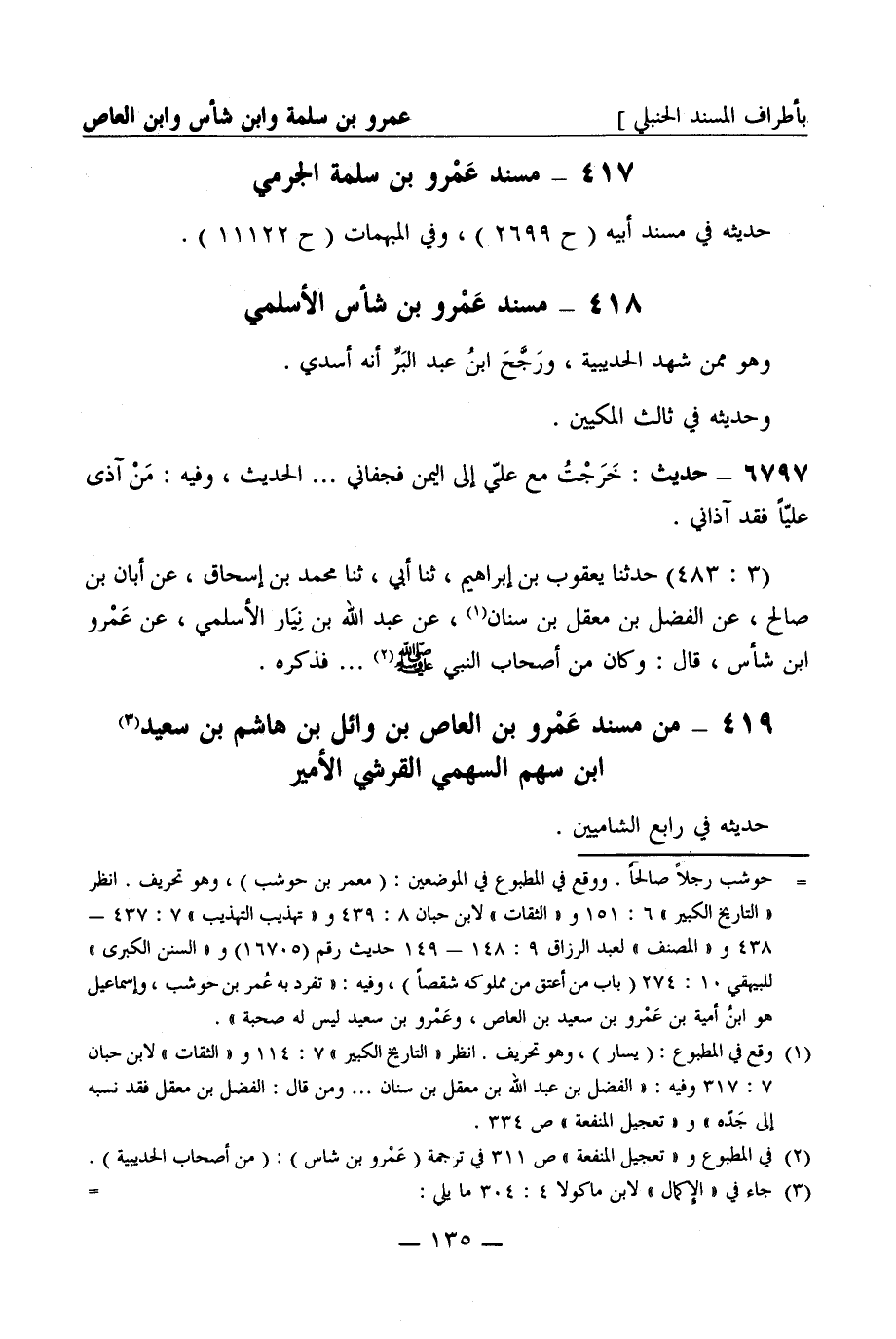 6797 - حديث: خرجت مع علي إلى اليمن فجفاني ... الحديث، وفيه: من آذى عليا فقد آذاني. (3: 483) حدثنا يعقوب بن إبراهيم، ثنا أبي، ثنا محمد بن إسحاق، عن أبان بن صالح، عن الفضل بن معقل بن سنان، عن عبد الله بن نيار الأسلمي، عن عمرو بن شأس، قال: وكان من أصحاب النبي صَلَّى اللَّهُ عَلَيْهِ وَسَلَّمَ ... فذكره.