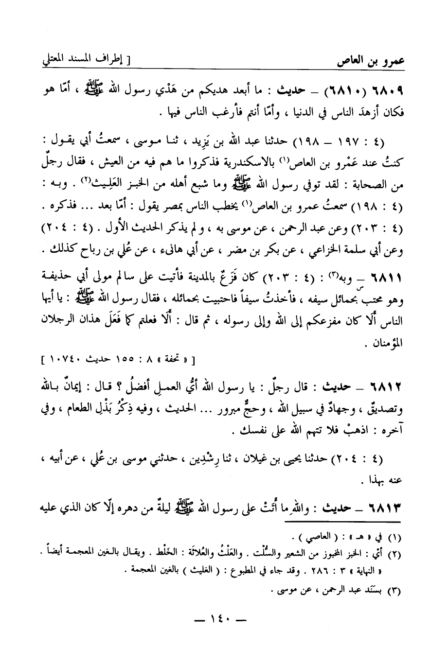6809 - (6810) - حديث: ما أبعد هديكم من هدي رسول الله صَلَّى اللَّهُ عَلَيْهِ وَسَلَّمَ، أما هو فكان أزهد الناس في الدنيا، وأما أنتم فأرغب الناس فيها. (4: 197 - 198) حدثنا عبد الله بن يزيد، ثنا موسى، سمعت أبي يقول: كنت عند عمرو بن العاص بالإسكندرية فذكروا ما هم فيه من العيش، فقال رجل من الصحابة: لقد توفي رسول الله صَلَّى اللَّهُ عَلَيْهِ وَسَلَّمَ وما شبع أهله من الخبز العليث. وبه: (4: 198) سمعت عمرو بن العاص يخطب الناس بمصر يقول: أما بعد ... فذكره. (4: 203) وعن عبد الرحمن، عن موسى به، ولم يذكر الحديث الأول. (4: 204) وعن أبي سلمة الخزاعي، عن بكر بن مضر، عن أبي هانئ، عن علي بن رباح كذلك.