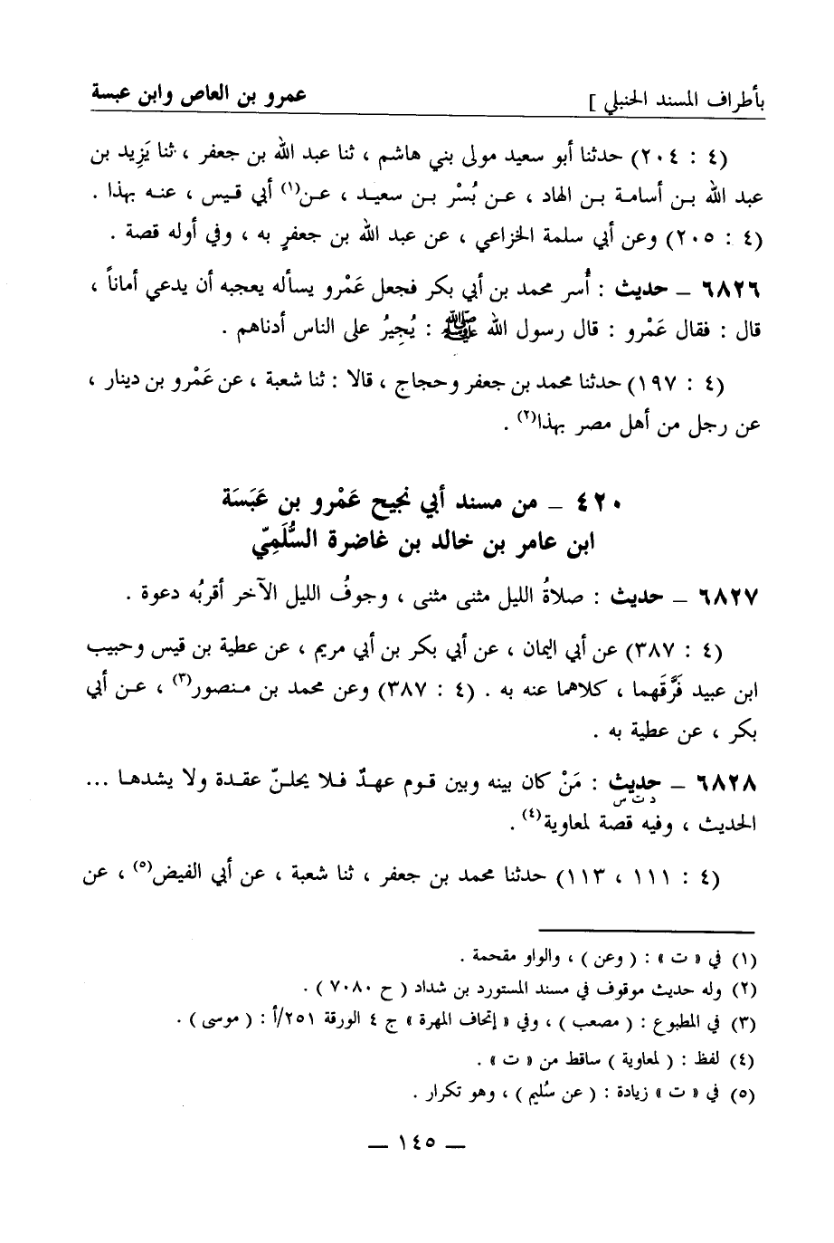 6827 -[د ت س] حديث: من كان بينه وبين قوم عهد فلا يحلن عقدة ولا يشدها ... . الحديث، وفيه قصة لمعاوية. (4: 111، 113) حدثنا محمد بن جعفر، ثنا شعبة، عن أبي الفيض، عن -[146]- سليم بن عامر، عنه به. (4: 113، 385 - 386) وعن عبد الرحمن بن مهدي ووكيع، عن شعبة نحوه.
