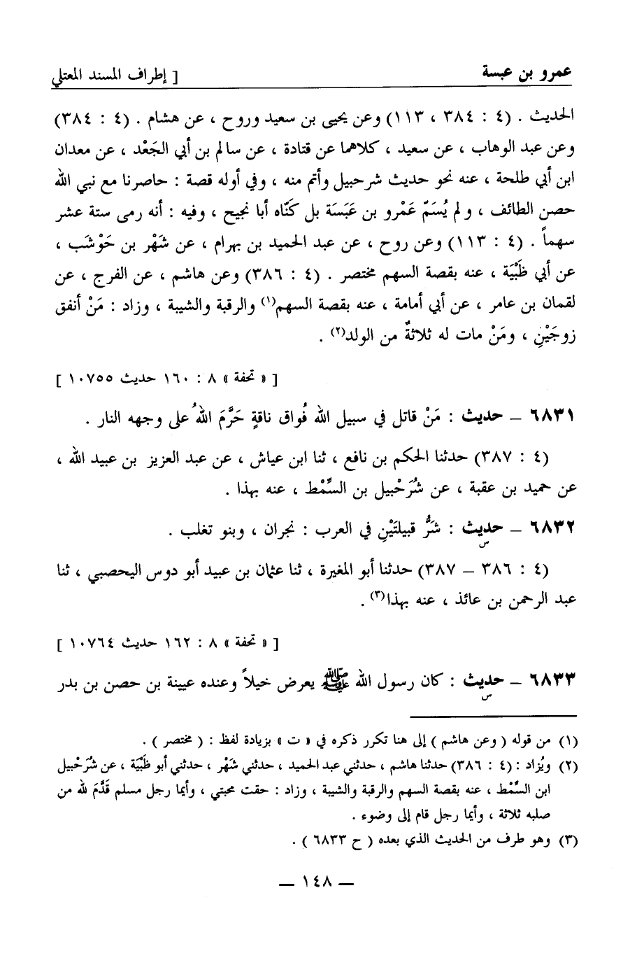6832 -[س] حديث: كان رسول الله صَلَّى اللَّهُ عَلَيْهِ وَسَلَّمَ يعرض خيلا وعنده عيينة بن حصن بن بدر -[149]- الفزاري، فقال له النبي صَلَّى اللَّهُ عَلَيْهِ وَسَلَّمَ: أن أفرس بالخيل منك ... . الحديث بطوله في ذكر القبائل. (4: 387) حدثنا أبو المغيرة، ثنا صفوان بن عمرو، حدثني شريح بن عبيد، عن عبد الرحمن بن عائذ عنه به. (4: 387) وعن حسن بن موسى، عن زهير، عن يزيد بن جابر، عن رجل، عن عمرو بن عبسة نحوه.