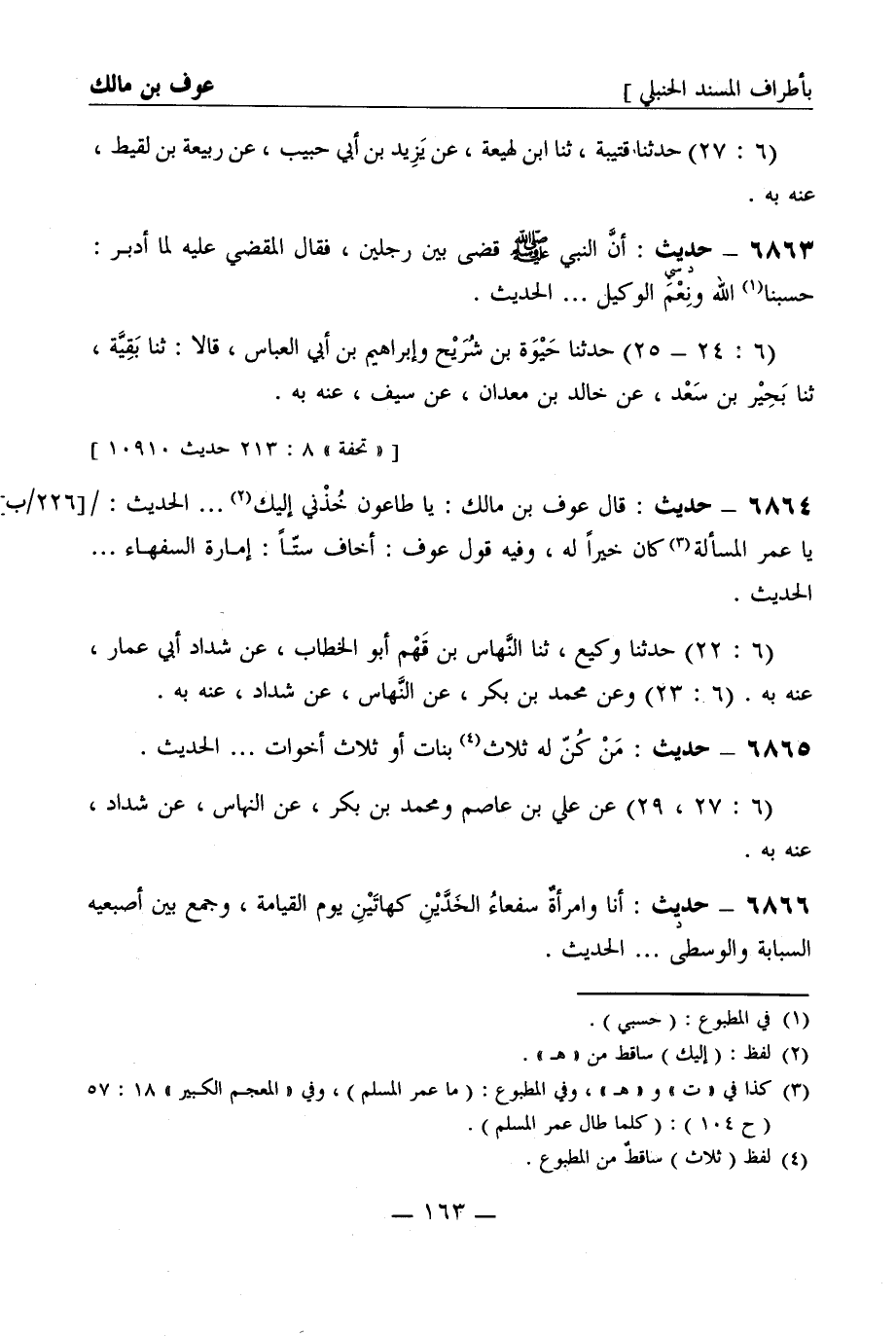 6865 - حديث: من كن له ثلاث بنات أو ثلاثة أخوات ... الحديث. (6: 27، 29) عن علي بن عاصم ومحمد بن بكر، عن النهاس، عن شداد، عنه به.