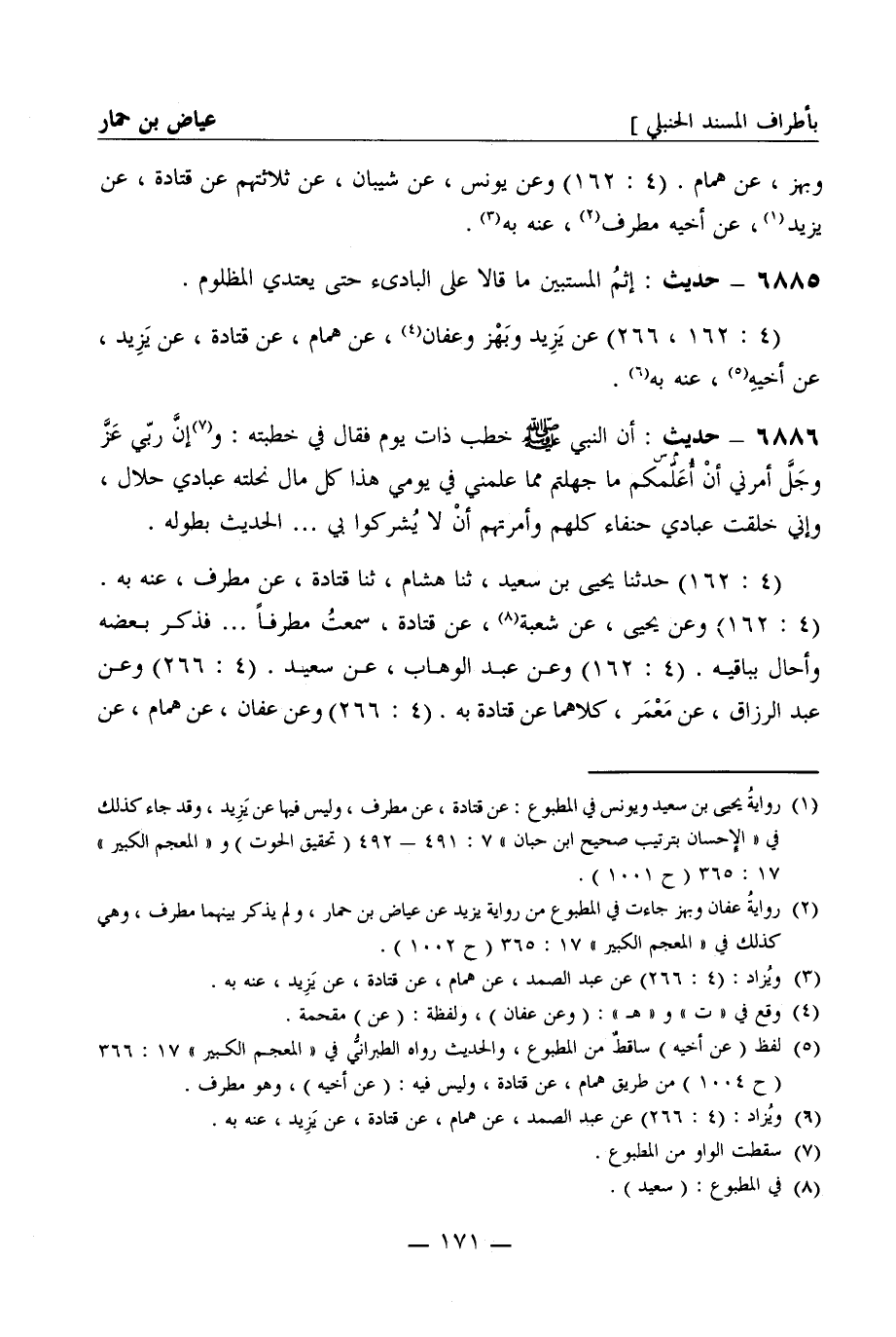 6886 -[م س] حديث: أن النبي صَلَّى اللَّهُ عَلَيْهِ وَسَلَّمَ خطب ذات يوم فقال في خطبته: وإن ربي عز وجل أمرني أن أعلمكم ما جهلتم مما علمني في يومي هذا كل مال نحلته عبادي حلال، وإني خلقت عبادي حنفاء كلهم وأمرتهم أن لا يشركوا بي ... الحديث بطوله. (4: 162) حدثنا يحيى بن سعيد، ثنا هشام، ثنا قتادة عن مطرف، عنه به. (4: 162) وعن يحيى، عن شعبة عن قتادة، سمعت مطرفا ... فذكر بعضه وأحال بباقيه. (4: 162) وعن عبد الوهاب، عن سعيد. (4: 266) وعن عبد الرزاق، عن معمر، كلاهما عن قتادة به. (4: 266) وعن عفان، عن همام، عن -[172]- قتادة، عن العلاء بن زياد العدوي قال: وحدثني يزيد أخو مطرف، قال: وحدثني عقبة، كل هؤلاء يقول: حدثني مطرف ... فذكره، قال همام: قال بعض أصحاب قتادة: ولا أعلمه قال إلا يونس الإسكاف أن قتادة لم يسمع حديث عياض من مطرف، قلت: هو حدثنا عن مطرف فجاء أعرابي فجعل يسأله واجترأ عليه، فقلنا له: سله هل سمع حديث عياض، فسأله فقال: لا، حدثني أربعة عن مطرف، فسمى ثلاثة الذي قلت لكم. (4: 266) وعن عوف، عن روح، عن حكيم الأثرم، عن الحسن، حدثني مطرف به.
