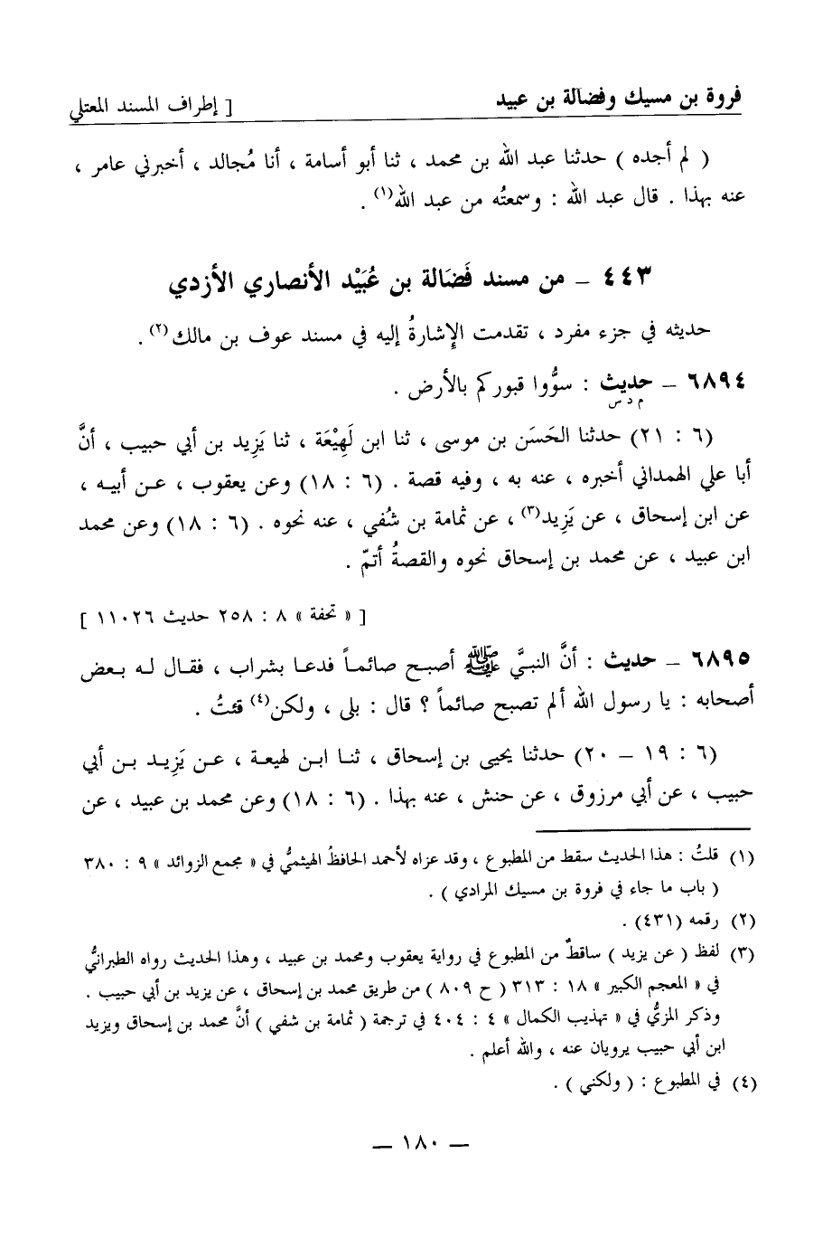 6895 - حديث: أن النبي صَلَّى اللَّهُ عَلَيْهِ وَسَلَّمَ أصبح صائما فدعا بشراب، فقال له بعض أصحابه: يا رسول الله ألم تصبح صائما؟ قال: بلى، ولكن قئت. (6: 19 - 20) حدثنا يحيى بن إسحاق، ثنا ابن لهيعة، عن يزيد بن أبي حبيب، عن أبي مرزوق، عن حنش، عنه بهذا. (6: 18) وعن محمد بن عبيد، عن -[181]- ابن إسحاق، عن يزيد نحوه. (6: 21) وعن يعقوب، عن أبيه، عن ابن إسحاق نحوه. (6: 22) وعن يحيى بن غيلان، عن المفضل بن فضالة، عن عبد الله بن عياش، عن يزيد نحوه.