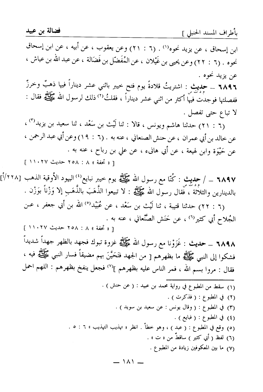 6896 -[م د ت س] حديث: اشتريت قلادة يوم فتح خيبر باثني عشر دينارا فيها ذهب وخرز ففصلتها فوجدت فيها أكثر من اثني عشر دينارا، فقلت ذلك لرسول الله صَلَّى اللَّهُ عَلَيْهِ وَسَلَّمَ فقال: لا تباع حتى تفصل. (6: 21) حدثنا هاشم ويونس، قالا: ثنا ليث بن سعد، ثنا سعيد بن يزيد، عن خالد بن أبي عمران، عن حنش الصنعاني، عنه به. (6: 19) وعن أبي عبد الرحمن، عن حيوة وابن لهيعة، عن أبي هانئ، عن علي بن رباح، عنه به.