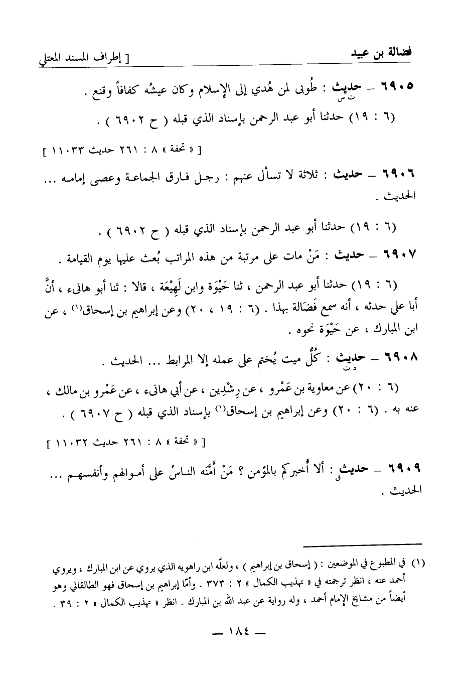 6907 - حديث: من مات على مرتبة من هذه المراتب بعث عليها يوم القيامة. (6: 19) حدثنا أبو عبد الرحمن، ثنا حيوة وابن لهيعة، قالا: ثنا أبو هانئ، أن أبا علي حدثه، أنه سمع فضالة بهذا. (6: 19، 20) وعن إبراهيم بن إسحاق، عن ابن المبارك، عن حيوة نحوه.