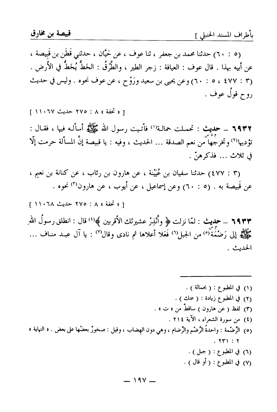 6932 -[م د س] حديث: تحملت حمالة فأتيت رسول الله صَلَّى اللَّهُ عَلَيْهِ وَسَلَّمَ أسأله فيها، فقال: تؤديها وتخرجها من نعم الصدقة ... الحديث، وفيه: يا قبيصة إن المسألة حرمت إلا في ثلاث ... فذكرهن. (3: 477) حدثنا سفيان بن عيينة، عن هارون بن رئاب، عن كنانة بن نعيم، عن قبيصة به. (5: 60) وعن إسماعيل، عن أيوب، عن هارون نحوه.