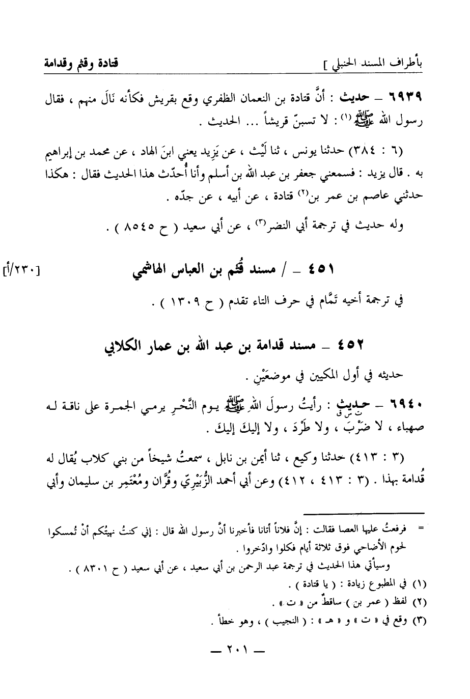 6940 -[ت س ق] حديث: رأيت رسول الله صَلَّى اللَّهُ عَلَيْهِ وَسَلَّمَ يوم النحر يرمي الجمرة على ناقة له صهباء، لا ضرب، ولا طرد، ولا إليك إليك. (3: 413) حدثنا وكيع، ثنا أيمن بن نابل، سمعت شيخا من بني كلاب يقال له قدامة بهذا. (3: 413، 412) وعن أبي أحمد الزبيري وقران ومعتمر بن سليمان وأبي -[202]- قرة موسى بن طارق الزبيدي، عن أيمن به، لكن حديث أبي قرة مختصر، وروى باقيه عن سفيان الثوري، عن أيمن. (3: 413) قال عبد الله: حدثني محرز بن عون وعباد بن موسى، قالا: ثنا قران بن تمام به.