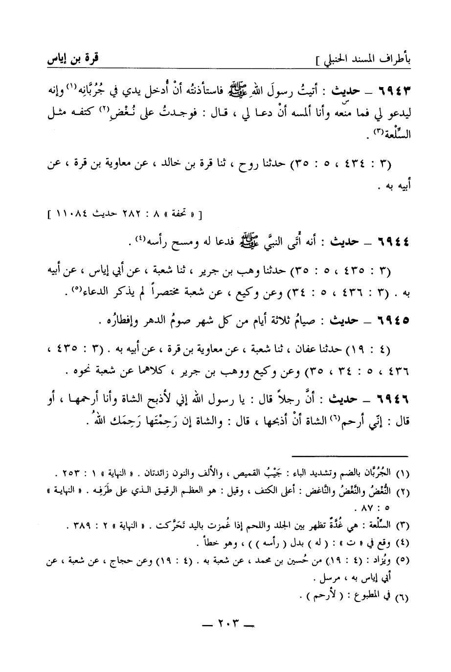 6943 -[س] حديث: أتيت رسول الله صَلَّى اللَّهُ عَلَيْهِ وَسَلَّمَ فاستأذنته أن أدخل يدي في جربانه وإنه ليدعو لي فما منعه وأنا ألمسه أن دعا لي، قال: فوجدت على نعض كتفه مثل السلعة. (3: 434، 5: 35) حدثنا روح، ثنا قرة بن خالد، عن معاوية بن قرة، عن أبيه به.