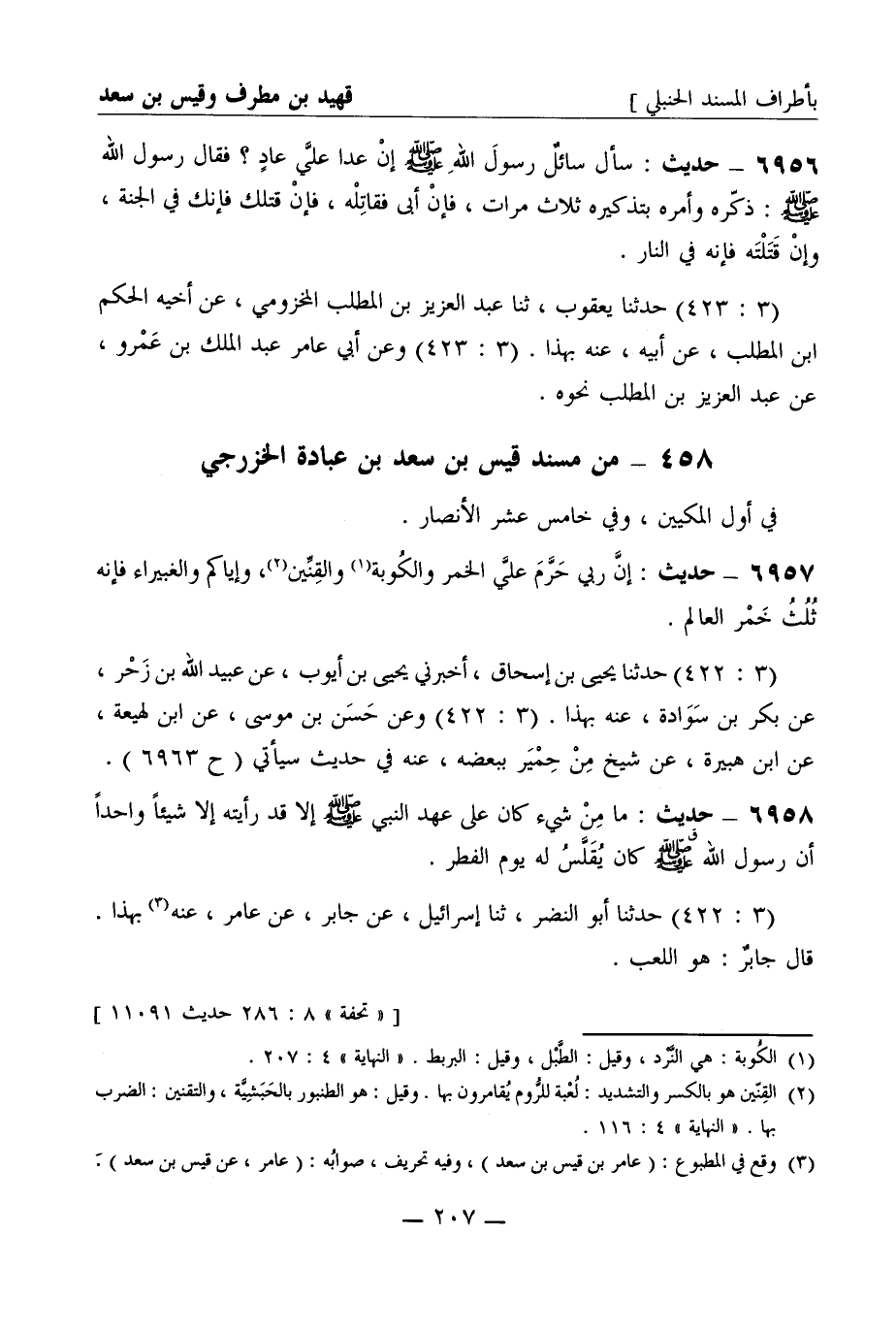 6957 - حديث: إن ربي حرم علي الخمر والكوبة والقنين، وإياكم والغبيراء فإنه ثلث خمر العالم. (3: 422) حدثنا يحيى بن إسحاق، أخبرني يحيى بن أيوب، عن عبيد الله بن زحر، عن بكر بن سوادة، عنه بهذا. (3: 422) وعن حسن بن موسى، عن ابن لهيعة، عن ابن هبيرة، عن شيخ من حمير ببعضه، عنه في حديث سيأتي (ح 6963) .