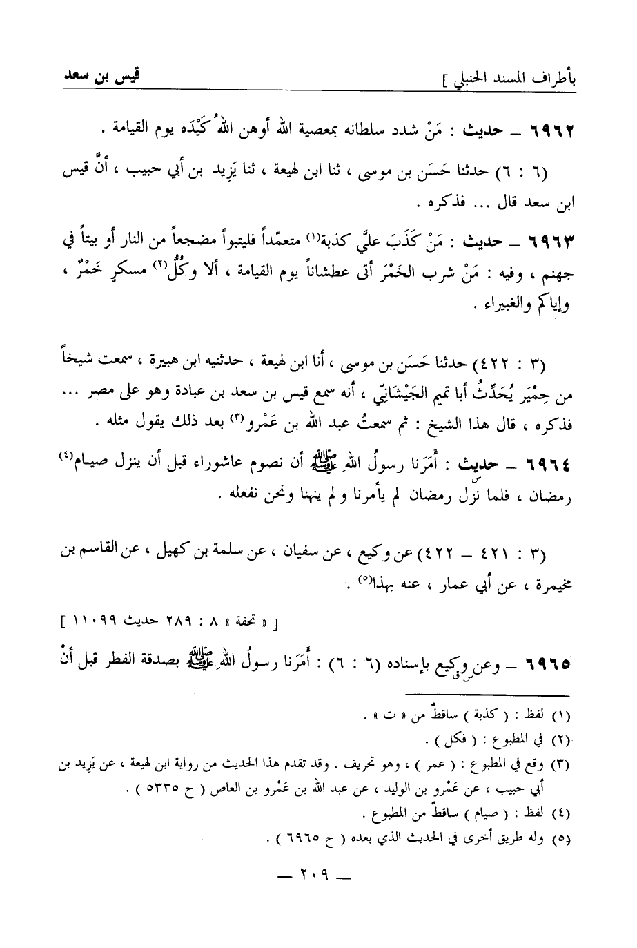 6963 - حديث: من كذب علي كذبة متعمدا فليتبوأ مضجعا من النار أو بيتا في جهنم، وفيه: من شرب الخمر أتى عطشانا يوم القيامة، ألا وكل مسكر خمر، وإياكم والغبيراء. (3: 422) حدثنا حسن بن موسى، أنا ابن لهيعة، حدثنيه ابن هبيرة، سمعت شيخا من حمير يحدث أبا تميم الجيشاني، أنه سمع قيس بن سعد بن عبادة وهو على مصر ... فذكره، قال هذا الشيخ: ثم سمعت عبد الله بن عمرو بعد ذلك يقول مثله.