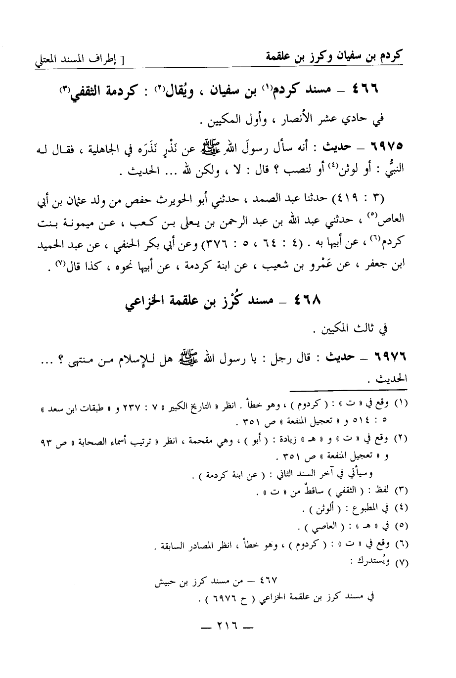 6975 - حديث: أنه سأل رسول الله صَلَّى اللَّهُ عَلَيْهِ وَسَلَّمَ عن نذر نذره في الجاهلية، فقال له النبي: أو لوثن أو لنصب؟ قال: لا، ولكن لله ... الحديث. (3: 419) حدثنا عبد الصمد، حدثني أبو الحويرث حفص من ولد عثمان بن أبي العاص، حدثني عبد الله بن عبد الرحمن بن يعلى بن كعب، عن ميمونة بنت كردم، عن أبيها به. (4: 64، 5: 376) وعن أبي بكر الحنفي، عن عبد الحميد بن جعفر، عن عمرو بن شعيب، عن ابنة كردمة، عن أبيها نحوه، كذا قال.