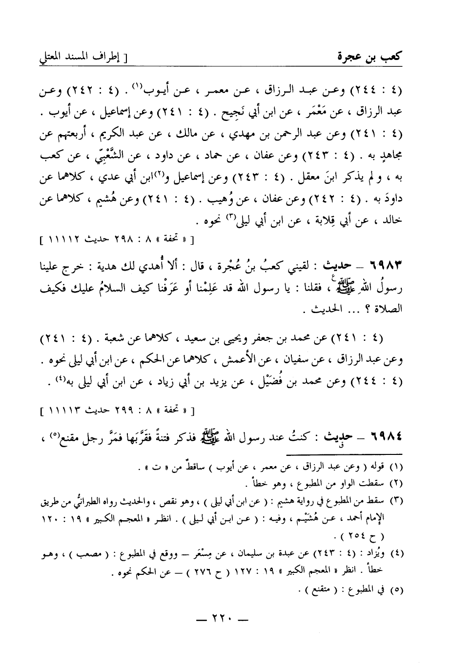 6983 -[ع] حديث: لقيني كعب بن عجرة، قال: لا أهدي لك هدية: خرج علينا رسول الله صَلَّى اللَّهُ عَلَيْهِ وَسَلَّمَ، فقلنا: يا رسول الله قد علمنا أو عرفنا كيف السلام عليك فكيف الصلاة؟ ... الحديث. (4: 241) عن محمد بن جعفر ويحيى بن سعيد، كلاهما عن شعبة. (4: 241) وعن عبد الرزاق، عن سفيان، عن الأعمش، كلاهما عن الحكم، عن ابن أبي ليلى نحوه. (4: 244) وعن محمد بن فضيل، عن يزيد بن أبي زياد، عن ابن أبي ليلى به.