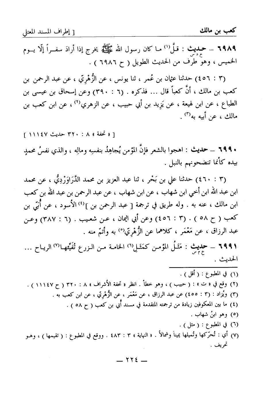 6989 -[خ د س] حديث: قل ما كان رسول الله صَلَّى اللَّهُ عَلَيْهِ وَسَلَّمَ يخرج إذا أراد سفرا إلا يوم الخميس، وهو طرف من الحديث الطويل (ح 6986) . (3: 456) حدثنا عثمان بن عمر، ثنا يونس، عن الزهري، عن عبد الرحمن بن كعب بن مالك، أن كعبا قال ... فذكره. (6: 390) وعن إسحاق بن عيسى بن الطباع، عن ابن لهيعة، عن يزيد بن أبي حبيب، عن الزهري، عن ابن كعب بن مالك، عن أبيه به.