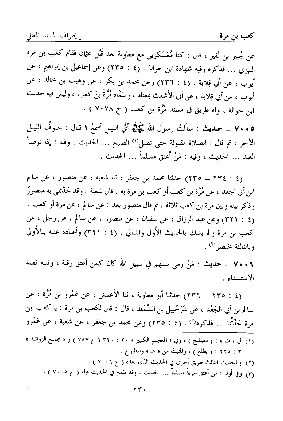 7005 - حديث: سألت رسول الله صَلَّى اللَّهُ عَلَيْهِ وَسَلَّمَ أي الليل أسمع؟ قال: جوف الليل الآخر، ثم قال: الصلاة مقبولة حتى تصلي الصبح ... الحديث. وفيه: إذا توضأ العبد ... الحديث، وفيه: من أعتق مسلما ... . الحديث. (4: 234 - 235) حدثنا محمد بن جعفر، ثنا شعبة، عن منصور، عن سالم بن أبي الجعد، عن مرة بن كعب أو كعب بن مرة به. قال شعبة: وقد حدثني به منصور وذكر بينه وبين مرة بن كعب ثلاثة، ثم قال منصور بعد: عن سالم، عن مرة أو كعب. (4: 321) وعن عبد الرزاق، عن سفيان، عن منصور، عن سالم، عن رجل، عن كعب بن مرة ولم يشك بالحديث الأول والثاني. (4: 321) وأعاده عنه بالأولى وبالثالثة مختصر.