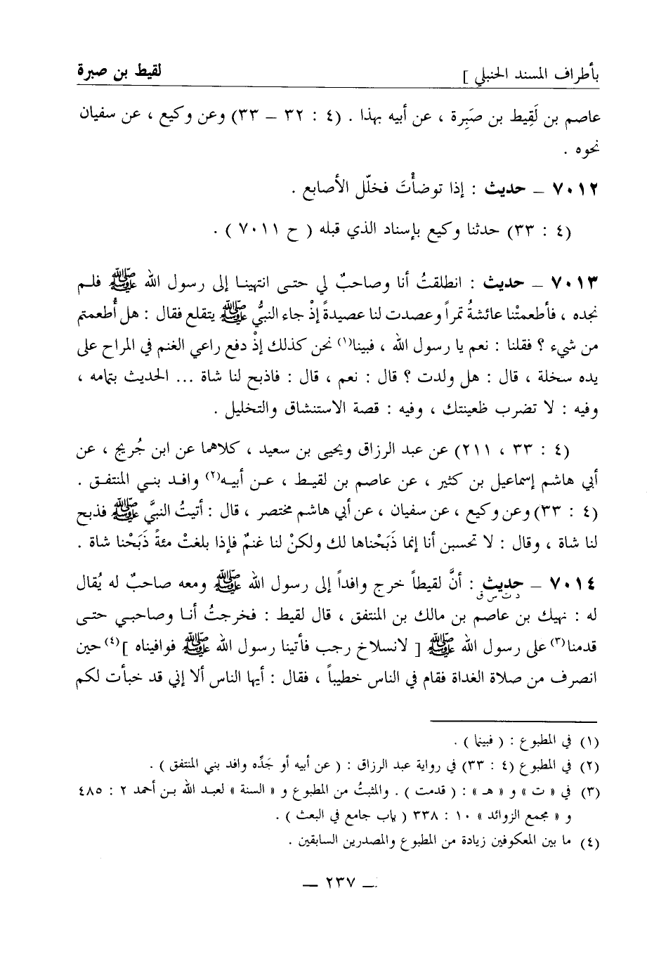 7013 - حديث: انطلقت أنا وصاحب لي حتى انتهينا إلى رسول الله صَلَّى اللَّهُ عَلَيْهِ وَسَلَّمَ فلم نجده، فأطعمتنا عائشة تمرا وعصدت لنا عصيدة إذ جاء النبي صَلَّى اللَّهُ عَلَيْهِ وَسَلَّمَ يتقلع فقال: هل أطعمتم من شيء؟ فقلنا: نعم يا رسول الله، فبينا نحن كذلك إذ دفع راعي الغنم في المراح على يده سخلة، قال: هل ولدت؟ قال: نعم، قال: فاذبح لنا شاة ... الحديث بتمامه، وفيه: لا تضرب ظعينتك، وفيه: قصة الاستنشاق والتخليل. (4: 33، 211) عن عبد الرزاق ويحيى بن سعيد، كلاهما عن ابن جريج، عن أبي هاشم إسماعيل بن كثير، عن عاصم بن لقيط، عن أبيه وافد بني المنتفق. (4: 33) وعن وكيع، عن سفيان، عن أبي هاشم مختصر، قال: أتيت النبي صَلَّى اللَّهُ عَلَيْهِ وَسَلَّمَ فذبح لنا شاة، وقال: لا تحسبن أنا إنما ذبحناها لك ولكن لنا غنم فإذا بلغت مائة ذبحنا شاة.