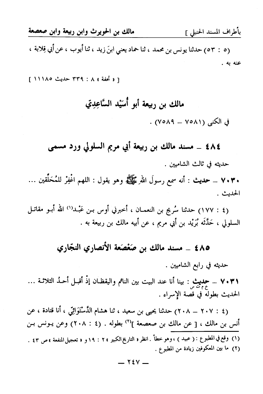 7031 -[خ م ت س] حديث: بينا أنا عند البيت بين النائم واليقظان إذ أقبل أحد الثلاثة ... الحديث بطوله في قصة الإسراء. (4: 207 - 208) حدثنا يحيى بن سعيد، ثنا هشام الدستوائي، أنا قتادة، عن أنس بن مالك، [عن مالك بن صعصعة] بطوله. (4: 208) وعن يونس بن -[248]- محمد، ثنا شيبان. (4: 208 - 210) وعن عفان، عن همام. (4: 210) وعن محمد بن جعفر ومحمد بن بكر، عن سعيد بن أبي عروبة، ثلاثتهم عن قتادة به، وفي حديث عفان وحده (4: 209) زيادة قتادة، عن الحسن، عن أبي هريرة في البيت المعمور: أنه يدخله كل يوم سبعون ألفا ثم لا يعودون فيه.
