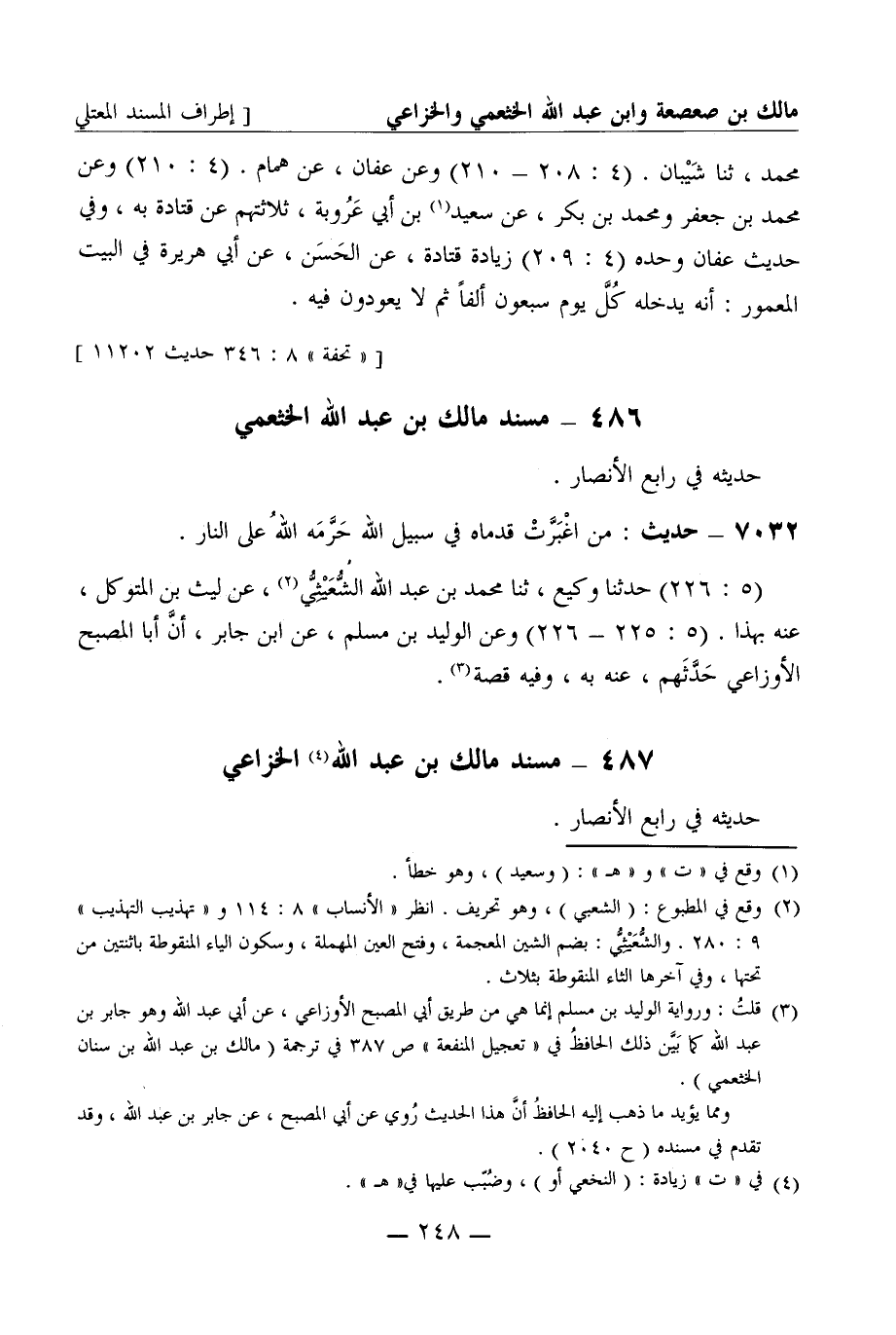 مسند مالك بن عبد الله الخثعمي حديثه في رابع الأنصار.