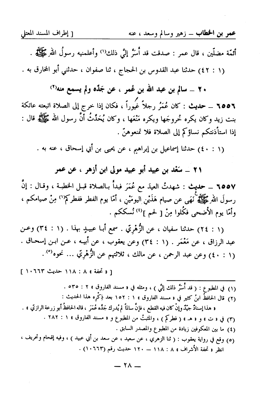 6557 -[ع] حديث: شهدت العيد مع عمر فبدأ بالصلاة قبل الخطبة، وقال: إن رسول الله صَلَّى اللَّهُ عَلَيْهِ وَسَلَّمَ نهى عن صيام هذين اليومين، أما يوم الفطر ففطركم من صيامكم، وأما يوم الأضحى فكلوا من [لحم] نسككم. (1: 24) حدثنا سفيان، عن الزهري. سمع أبا عبيد بهذا. (1: 34) وعن عبد الرزاق، عن معمر. (1: 34) وعن يعقوب، عن أبيه، عن ابن إسحاق. (1: 40) وعن عبد الرحمن، عن مالك، ثلاثتهم عن الزهري ... نحوه.