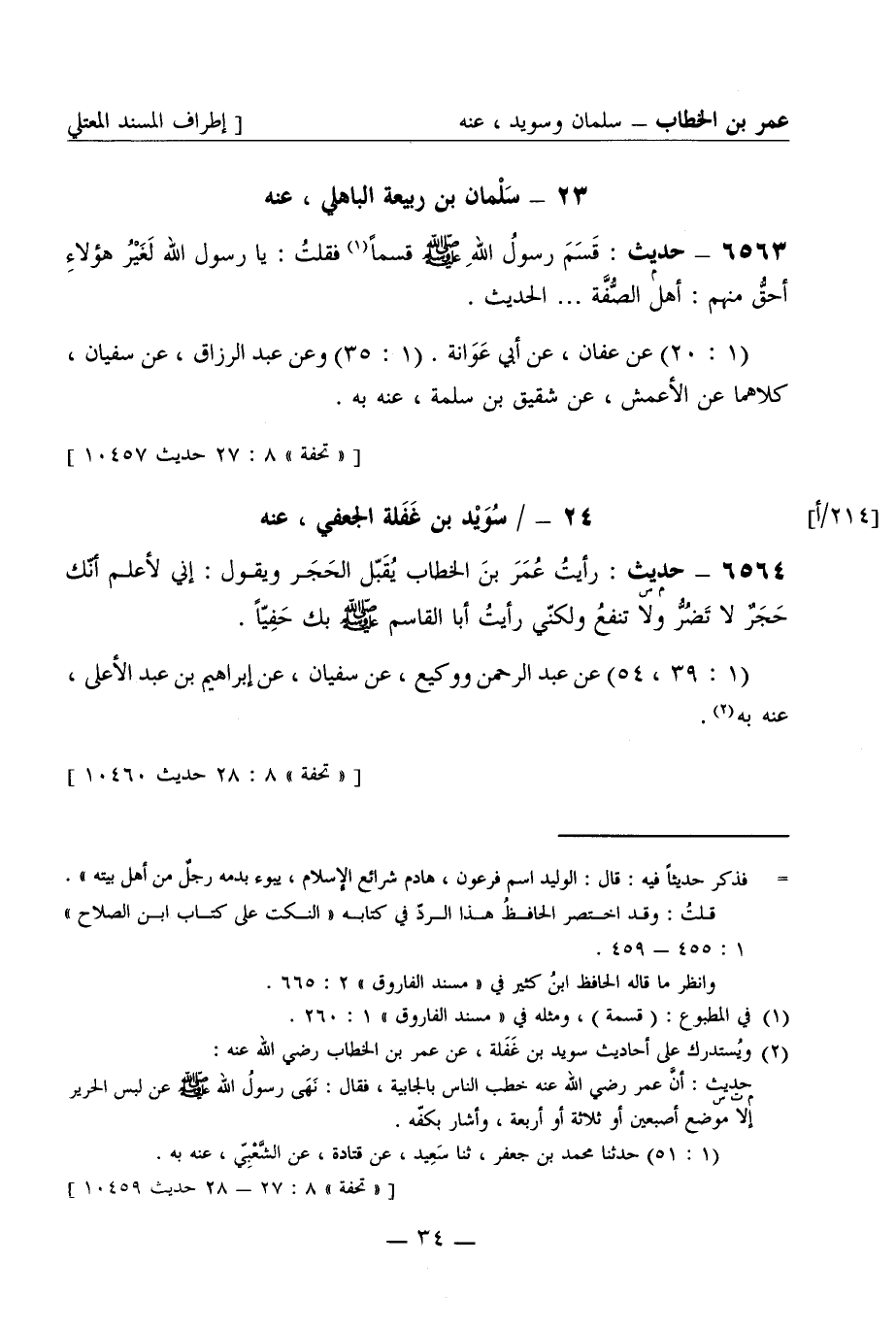 6564 -[م س] حديث: رأيت عمر بن الخطاب يقبل الحجر ويقول: إني لأعلم أنك حجر لا تضر ولا تنفع ولكني رأيت أبا القاسم صَلَّى اللَّهُ عَلَيْهِ وَسَلَّمَ بك حفيا. (1: 39، 54) عن عبد الرحمن ووكيع، عن سفيان، عن إبراهيم بن عبد الأعلى، عنه به.