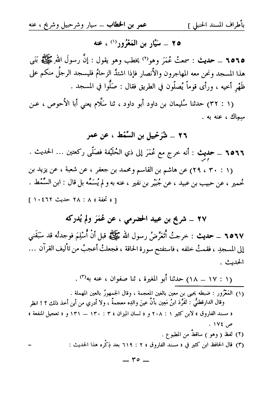 6565 - حديث: سمعت عمر وهو يخطب وهو يقول: إن رسول الله صَلَّى اللَّهُ عَلَيْهِ وَسَلَّمَ بنى هذا المسجد ونحن معه المهاجرون والأنصار فإذا اشتد الزحام فليسجد الرجل منكم على ظهر أخيه، ورأى قوما يصلون في الطريق فقال: صلوا في المسجد. (1: 32) حدثنا سليمان بن داود أبو داود، ثنا سلام يعني أبا الأحوص، عن سماك، عنه به.