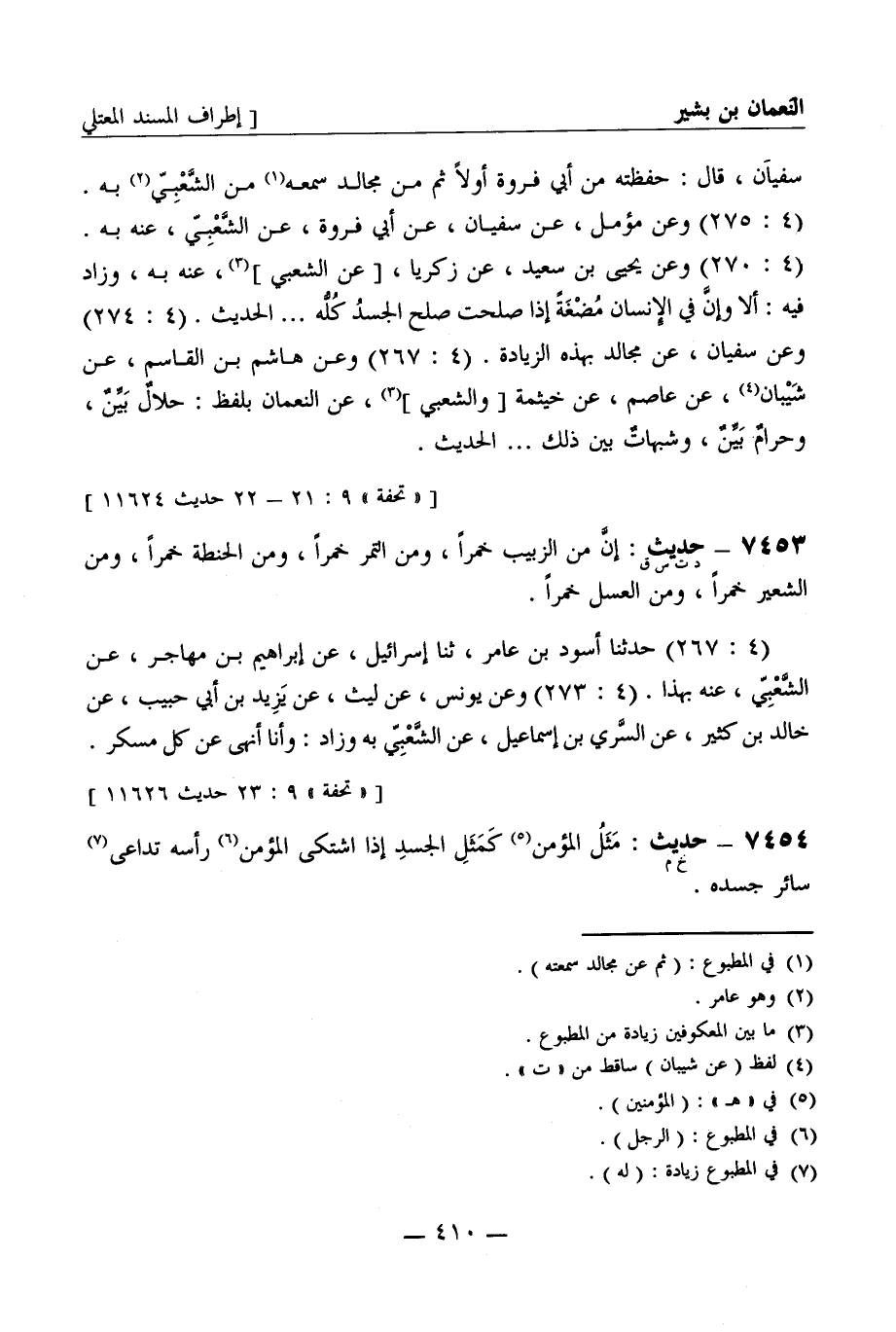 7454 -[خ م] حديث: مثل المؤمن كمثل الجسد إذا اشتكى المؤمن رأسه تداعى سائر جسده -[411]-. (4: 268) حدثنا أبو معاوية، عن الأعمش، عن الشعبي، عنه به. (4: 276) وعن وكيع، عن الأعمش به. (4: 270) وعن يحيى بن سعيد وأبي نعيم وإسحاق بن يوسف، ثلاثتهم عن زكريا، [عن الشعبي] ، عنه نحوه. (4: 276، 271) وعن وكيع، عن الأعمش، عن خيثمة، عن النعمان بلفظ: المؤمنون كرجل واحد إن شكى رأسه شكى كله، وإن اشتكى عينه اشتكى كله. (4: 274) وعن يونس وسريج، كلاهما عن حماد، عن سماك، عنه بلفظ: مثل المؤمنين كمثل الجسد إذا ألم بعضه تداعى سائره. (4: 278، 375) قال عبد الله: حدثنا معاوية بن عبد الله بن معاوية بن عاصم بن المنذر، ثنا سلام أبو المنذر، ثنا عاصم ابن بهدلة، [عن الشعبي] أو خيثمة، عن النعمان نحوه.