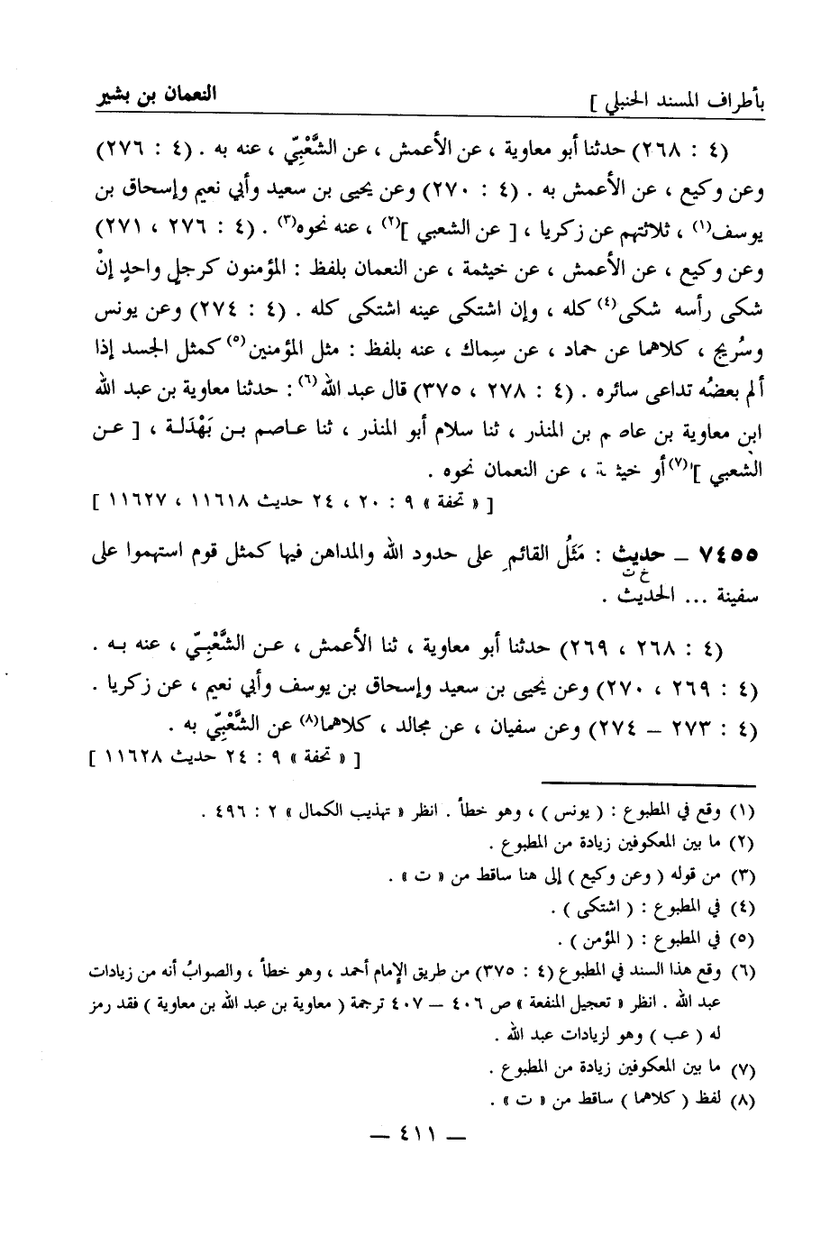 7455 -[خ ت] حديث: مثل القائم على حدود الله والمداهن فيها كمثل قوم استهموا على سفينة ... الحديث. (4: 268، 269) حدثنا أبو معاوية، ثنا الأعمش، عن الشعبي، عنه به. (4: 269، 270) وعن يحيى بن سعيد وإسحاق بن يوسف وأبي نعيم، عن زكريا. (4: 273 - 274) وعن سفيان، عن مجالد، كلاهما عن الشعبي به.