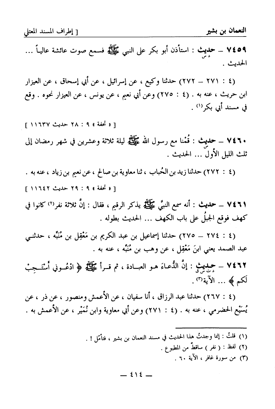7462 -[د ت س ق] حديث: إن الدعاء هو العبادة، ثم قرأ صَلَّى اللَّهُ عَلَيْهِ وَسَلَّمَ ادعوني أستجب لكم ... الآية. (4: 267) حدثنا عبد الرزاق، أنا سفيان، عن الأعمش ومنصور، عن ذر، عن يسيع الحضرمي، عنه به. (4: 271) وعن أبي معاوية وابن نمير، عن الأعمش به -[415]-. (4: 277) وعن محمد بن جعفر، عن شعبة، عن منصور به. (4: 276) وعن عبد الرحمن، عن سفيان به.