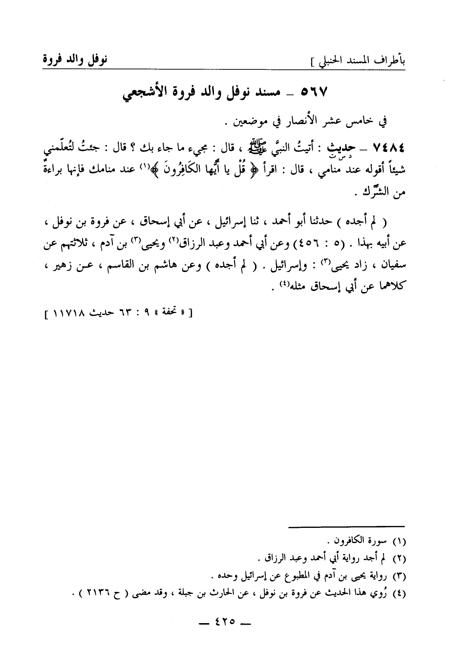 7484 - (د س ت) حديث: أتيت النبي صَلَّى اللَّهُ عَلَيْهِ وَسَلَّمَ، قال: مجيء ما جاء بك؟ قال: جئت لتعلمني شيئا أقوله عند منامي، قال: اقرأ قل يا أيها الكافرون عند منامك فإنها براءة من الشرك. (لم أجده) حدثنا أبو أحمد، ثنا إسرائيل، عن أبي إسحاق، عن فروة بن نوفل، عن أبيه بهذا. (5: 456) وعن أبي أحمد وعبد الرزاق ويحيى بن آدم، ثلاثتهم عن سفيان، زاد يحيى: وإسرائيل. (لم أجده) وعن هاشم بن القاسم، عن زهير، كلاهما عن أبي إسحاق مثله.