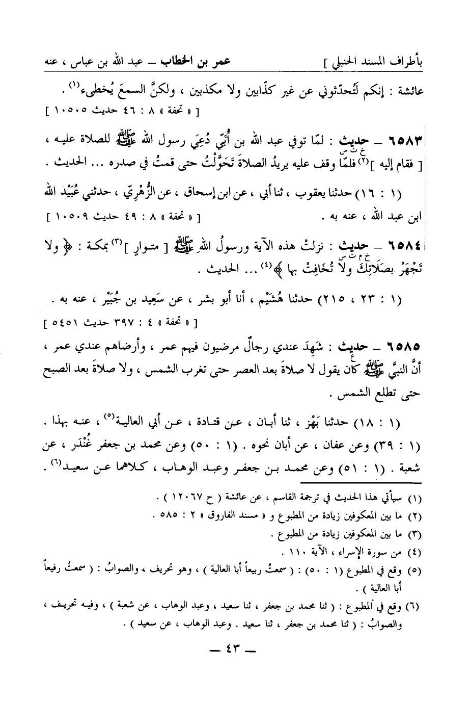 6585 -[ع] حديث: شهد عندي رجال مرضيون فيهم عمر، وأرضاهم عندي عمر أن النبي صَلَّى اللَّهُ عَلَيْهِ وَسَلَّمَ كان يقول لا صلاة بعد العصر حتى تغرب الشمس، ولا صلاة بعد الصبح حتى تطلع الشمس. (1: 18) حدثنا بهز، ثنا أبان، عن قتادة، عن أبي العالية، عنه بهذا. (1: 39) وعن عفان، عن أبان نحوه. (1: 50) وعن محمد بن جعفر غندر، عن شعبة. (1: 51) وعن محمد بن جعفر وعبد الوهاب، كلاهما عن سعيد -[44]-. (1: 20 - 21، 39) وعن عفان بن مسلم، عن همام، كلهم عن قتادة به.