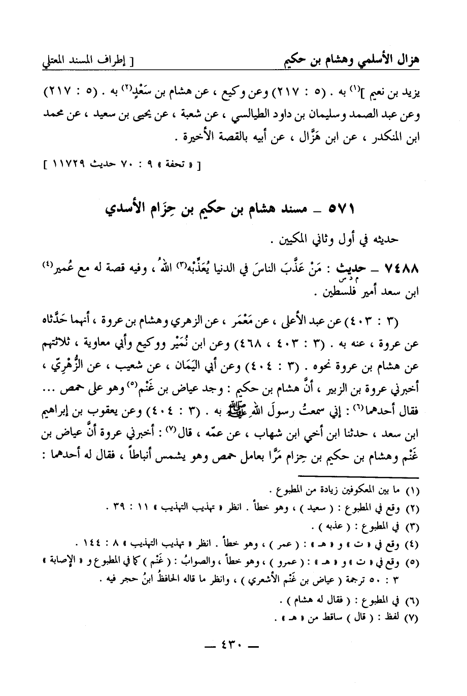 7488 -[م د س] حديث: من عذب الناس في الدنيا يعذبه الله، وفيه قصة له مع عمير بن سعد أمير فلسطين. (3: 403) عن عبد الأعلى، عن معمر، عن الزهري وهشام بن عروة، أنهما حدثاه عن عروة، عنه به. (3: 403، 468) وعن ابن نمير ووكيع وأبي معاوية، ثلاثتهم عن هشام بن عروة نحوه. (3: 404) وعن أبي اليمان، عن شعيب، عن الزهري، أخبرني عروة بن الزبير، أن هشام بن حكيم: وجد عياض بن غنم وهو على حمص ... فقال أحدهما: إني سمعت رسول الله صَلَّى اللَّهُ عَلَيْهِ وَسَلَّمَ به. (3: 404) وعن يعقوب بن إبراهيم بن سعد، حدثنا ابن أخي ابن شهاب، عن عمه، قال: أخبرني عروة أن عياض بن غنم وهشام بن حكيم بن حزام مرا بعامل حمص وهو يشمس أنباطا، فقال له أحدهما: -[431]- ما هذا؟ ... . الحديث، كذا قال ابن أخي الزهري. (3: 403 - 404) وعن أبي المغيرة، عن صفوان، عن شريح بن عبيد وغيره، قال جلد عياض بن غنم صاحب داريا حين فتحت فأغلظ له هشام ... فذكر قصة هذا فيها، وفيها حديث عياض: أولم تسمع رسول الله صَلَّى اللَّهُ عَلَيْهِ وَسَلَّمَ إذ يقول: من أراد أن ينصح لذي سلطان بأمر فلا يبد له علانية ولكن ليأخذ بيده فيخلو به، فإن قبل منه فذاك، وإلا كان قد أدى الذي عليه له، وذكر قصة.