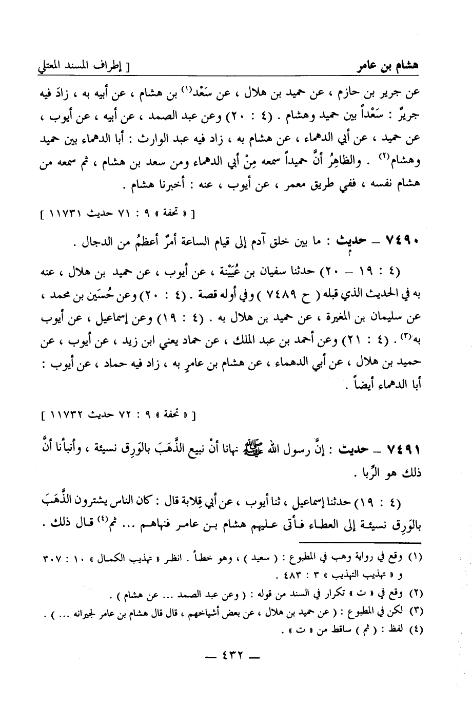 7491 - حديث: إن رسول الله صَلَّى اللَّهُ عَلَيْهِ وَسَلَّمَ نهانا أن نبيع الذهب بالورق نسيئة، وأنبأنا أن ذلك هو الربا. (4: 19) حدثنا إسماعيل، ثنا أيوب، عن أبي قلابة قال: كان الناس يشترون الذهب بالورق نسيئة إلى العطاء فأتى عليهم هشام بن عامر فنهاهم ... ثم قال ذلك -[433]-. (4: 20 - 21) وعن حسن بن موسى، عن حماد يعني ابن زيد، عن أيوب، عن أبي قلابة، قال: قدم هشام بن عامر البصرة ... فذكره.