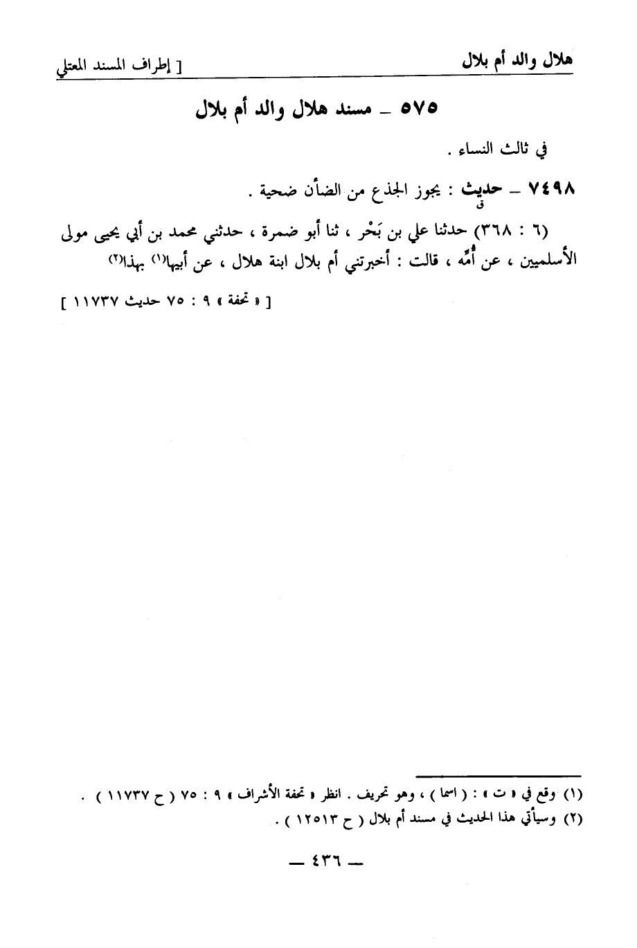 7498 -[ق] حديث: يجوز الجذع من الضأن ضحية. (6: 368) حدثنا علي بن بحر، ثنا أبو ضمرة، حدثني محمد بن أبي يحيى مولى الأسلميين، عن أمه، قالت: أخبرتني أم بلال ابنة هلال، عن أبيها بهذا.