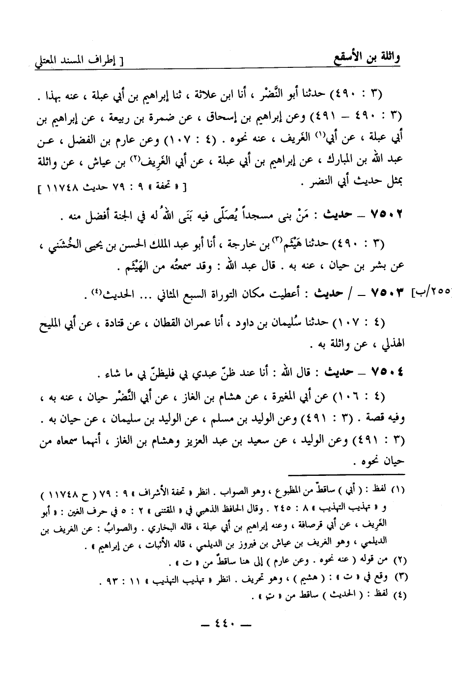 7503 - حديث: أعطيت مكان التوراة السبع المثاني ... . الحديث. (4: 107) حدثنا سليمان بن داود، أنا عمران القطان، عن قتادة، عن أبي المليح الهذلي، عن واثلة به.