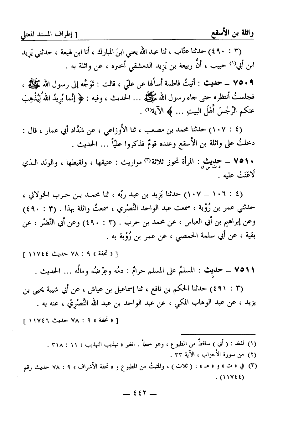 7509 - حديث: أتيت فاطمة أسألها عن علي، قالت: توجه إلى رسول الله صَلَّى اللَّهُ عَلَيْهِ وَسَلَّمَ، فجلست أنتظره حتى جاء رسول الله صَلَّى اللَّهُ عَلَيْهِ وَسَلَّمَ ... الحديث، وفيه: إنما يريد الله ليذهب عنكم الرجس أهل البيت ... الآية. (4: 107) حدثنا محمد بن مصعب، ثنا الأوزاعي، عن شداد أبي عمار، قال: دخلت على واثلة بن الأسقع وعنده قوم فذكروا عليا ... الحديث.