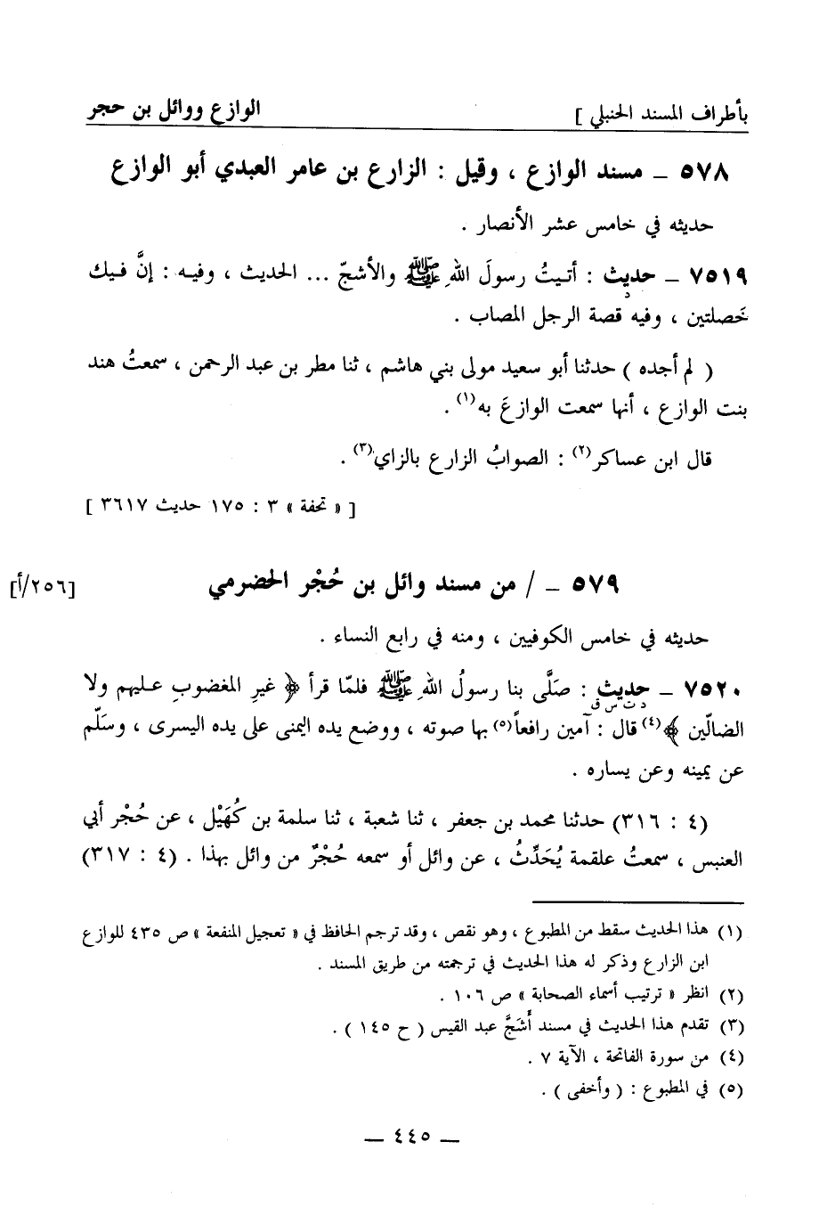 7520 -[د ت س ق] حديث: صلى بنا رسول الله صَلَّى اللَّهُ عَلَيْهِ وَسَلَّمَ فلما قرأ غير المغضوب عليهم ولا الضالين قال: آمين رافعا بها صوته، ووضع يده اليمنى على يده اليسرى، وسلم عن يمينه وعن يساره. (4: 316) حدثنا محمد بن جعفر، ثنا شعبة، ثنا سلمة بن كهيل، عن حجر أبي العنبس، سمعت علقمة يحدث، عن وائل أو سمعه حجر من وائل بهذا -[446]-. (4: 317) وعن محمد بن عبد الله بن الزبير، عن سفيان، عن سلمة، عن حجر، عن وائل بالقصة الثالثة. (4: 316) وعن وكيع، عن سفيان بسنده بالقصة الأولى. (4: 316) وعن عبد الرحمن، عن شعبة به. (4: 318) وعن يحيى بن أبي بكير، عن زهير، عن أبي إسحاق، عن عبد الجبار بن وائل، عن أبيه بالقصة الأولى والثانية، وزاد: قريبا من الرصغ، وزاد: ويضع يده حين يوجب حتى تبلغا أذنيه ... الحديث. (4: 315) وعن عبد القدوس بن بكر، عن الحجاج، عن عبد الجبار بن وائل، عن أبيه: أنه سمع النبي صَلَّى اللَّهُ عَلَيْهِ وَسَلَّمَ يقول آمين. (4: 316) وعن وكيع، عن موسى بن عمير، عن علقمة بن وائل، عن أبيه بالقصة الثانية.