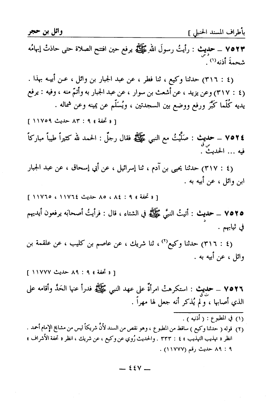 7523 -[د س] حديث: رأيت رسول الله صَلَّى اللَّهُ عَلَيْهِ وَسَلَّمَ يرفع حين افتتح الصلاة حتى حاذت إبهامه شحمة أذنه. (4: 316) حدثنا وكيع، ثنا فطر، عن عبد الجبار بن وائل، عن أبيه بهذا. (4: 317) وعن يزيد، عن أشعث بن سوار، عن عبد الجبار به وأتم منه، وفيه: يرفع يديه كلما كبر ورفع ووضع بين السجدتين، ويسلم عن يمينه وعن شماله.