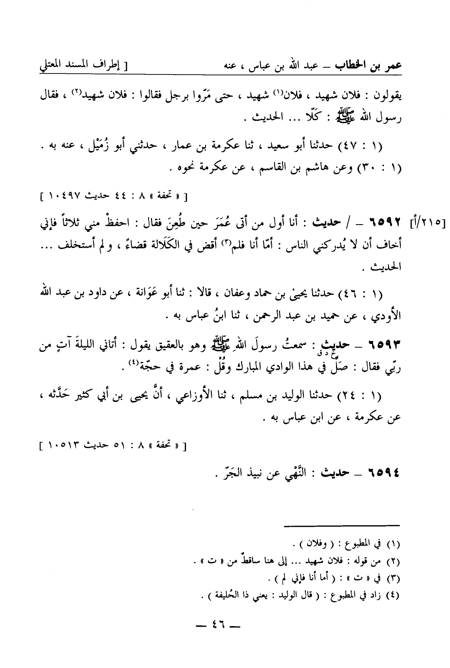 6592 - حديث: أن أول من أتى عمر حين طعن فقال: احفظ مني ثلاثا فإني أخاف أن لا يدركني الناس: أما أنا فلم أقض في الكلالة قضاء، ولم أستخلف ... الحديث. (1: 46) حدثنا يحيى بن حماد وعفان، قالا: ثنا أبو عوانة، عن داود بن عبد الله الأودي، عن حميد بن عبد الرحمن، ثنا ابن عباس به.