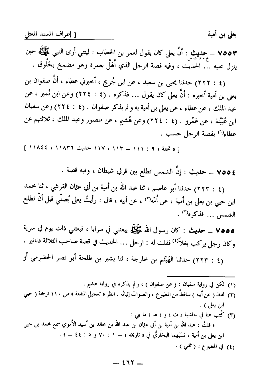 7553 -[خ م د ت س] حديث: أن يعلى كان يقول لعمر بن الخطاب: ليتني أرى النبي صَلَّى اللَّهُ عَلَيْهِ وَسَلَّمَ حين ينزل عليه ... الحديث، وفيه قصة الرجل الذي أهل بعمرة وهو مضمخ بخلوق. (4: 222) حدثنا يحيى بن سعيد، عن ابن جريج، أخبرني عطاء، أن صفوان بن يعلى بن أمية أخبره: أن يعلى كان يقول ... فذكره. (4: 224) وعن ابن نمير، عن عن عبد الملك، عن عطاء، عن يعلى بن أمية به ولم يذكر صفوان. (4: 224) وعن سفيان بن عيينة، عن عمرو. (4: 224) وعن هشيم، عن منصور وعبد الملك، ثلاثتهم عن عطاء بقصة الرجل حسب.