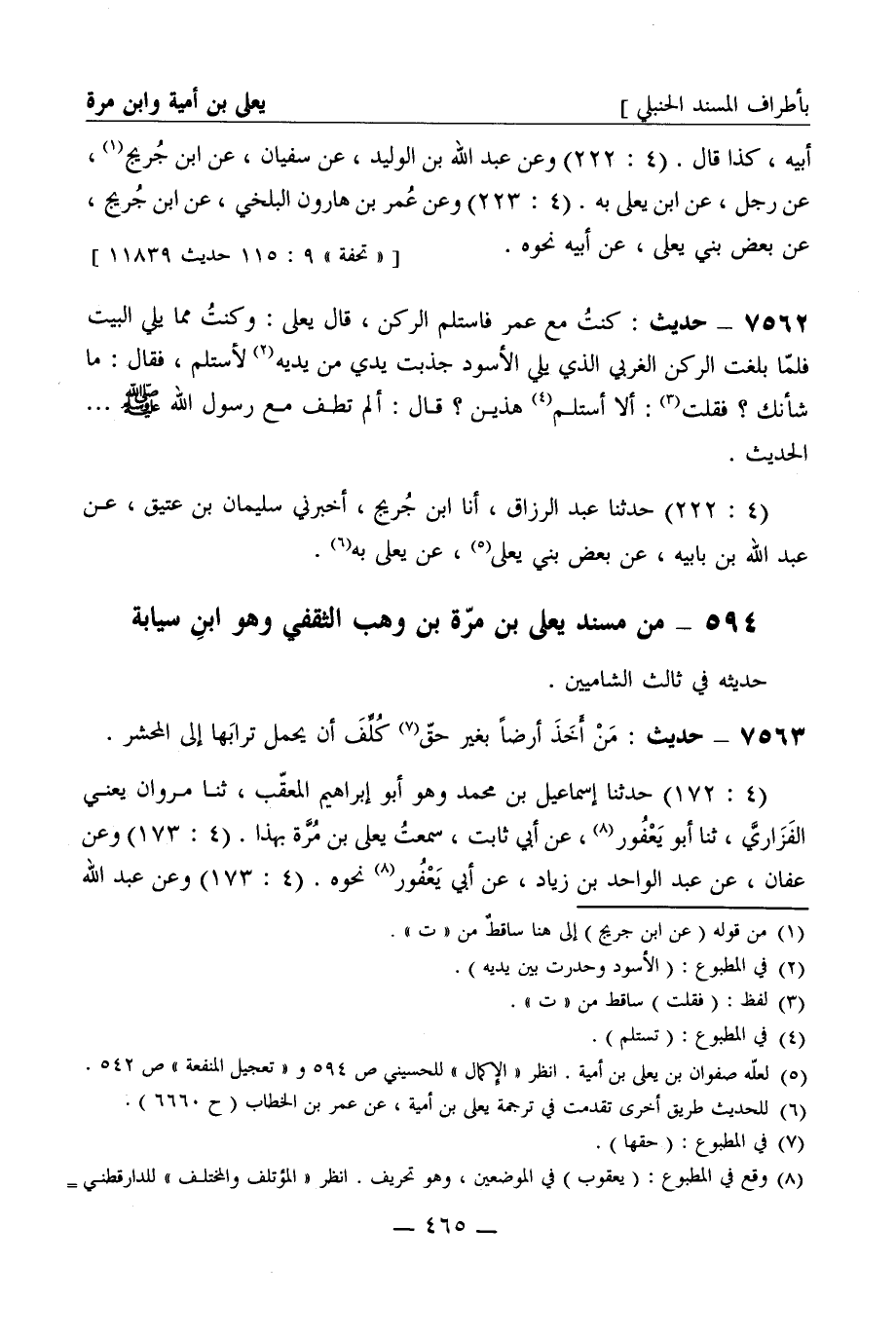 7562 - حديث: كنت مع عمر فاستلم الركن، قال يعلى: وكنت مما يلي البيت فلما بلغت الركن الغربي الذي يلي الأسود جذبت يدي من يديه لأستلم، فقال: ما شأنك؟ فقلت: ألا أستلم هذين؟ قال: ألم تطف مع رسول الله صَلَّى اللَّهُ عَلَيْهِ وَسَلَّمَ ... الحديث. (4: 222) حدثنا عبد الرزاق، أنا ابن جريج، أخبرني سليمان بن عتيق، عن عبد الله بن بابيه، عن بعض بني يعلى، عن يعلى به.