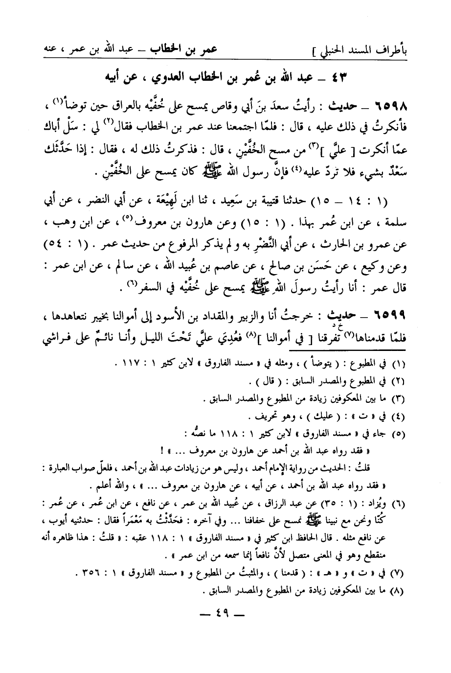 6598 - حديث: رأيت سعد بن أبي وقاص يمسح على خفيه بالعراق حين توضأ، فأنكرت في ذلك عليه، قال: فلما اجتمعنا عند عمر بن الخطاب فقال لي: سل أباك عما أنكرت [علي] من مسح الخفين، قال فذكرت ذلك له، فقال: إذا حدثك سعد بشيء فلا ترد عليه فإن رسول الله صَلَّى اللَّهُ عَلَيْهِ وَسَلَّمَ كان يمسح على الخفين. (1: 14 - 15) حدثنا قتيبة بن سعيد، ثنا ابن لهيعة، عن أبي النضر، عن أبي سلمة، عن ابن عمر بهذا. (1: 15) وعن هارون بن معروف، عن ابن وهب، عن عمرو بن الحارث، عن أبي النضر به ولم يذكر المرفوع من حديث عمر. (1: 54) وعن وكيع، عن حسن بن صالح، عن عاصم بن عبيد الله، عن سالم، عن ابن عمر: قال عمر: أنا رأيت رسول الله صَلَّى اللَّهُ عَلَيْهِ وَسَلَّمَ يمسح على خفيه في السفر.