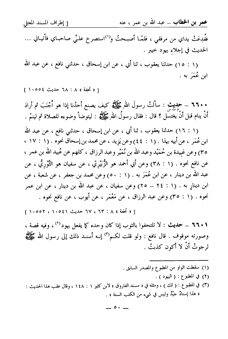 6601 - حديث: لا تلتحفوا بالثوب إذا كان وحده كما يفعل يهود، وفيه قصة، وصورته موقوف. قال نافع: ولو قلت لكم إنه أسند ذلك إلى رسول الله صَلَّى اللَّهُ عَلَيْهِ وَسَلَّمَ لرجوت أن لا أكون كذبت -[51]-. (1: 16) حدثنا يعقوب، ثنا أبي، عن ابن إسحاق، حدثني نافع، عنه به.