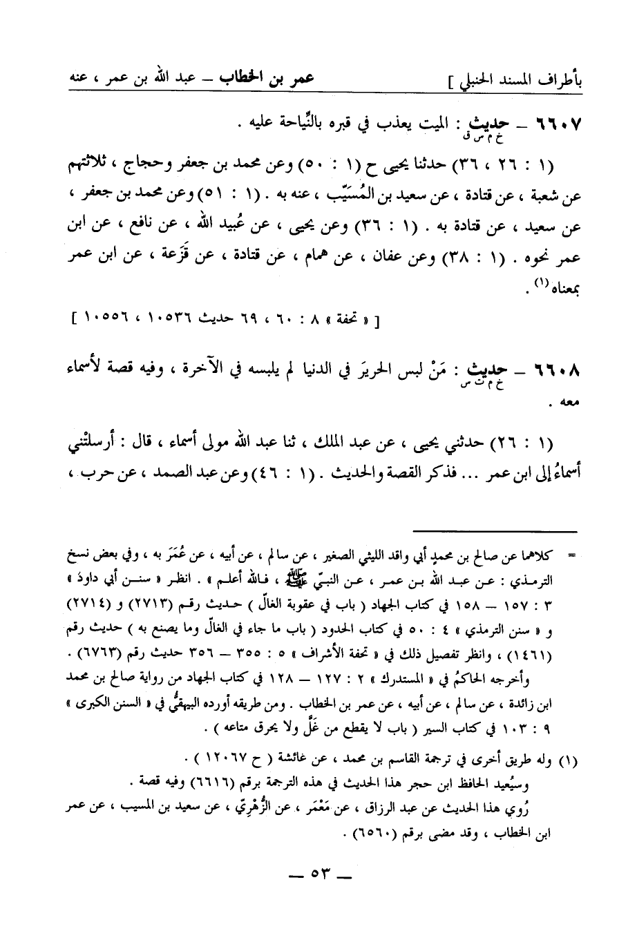 6608 -[خ م ت س] حديث: من لبس الحرير في الدنيا لم يلسبه في الآخرة، وفيه قصة لأسماء معه. (1: 26) حدثني يحيى، عن عبد الملك، ثنا عبد الله مولى أسماء، قال: أرسلتني أسماء إلى ابن عمر ... فذكر القصة والحديث. (1: 46) وعن عبد الصمد، عن حرب -[54]-، [عن يحيى] ، عن عمران بن حطان، عنه بالحديث دون القصة. (1: 49) وعن محمد بن بكر، عن عيينة، عن علي بن زيد، عن سالم، عنه بالحديث.
