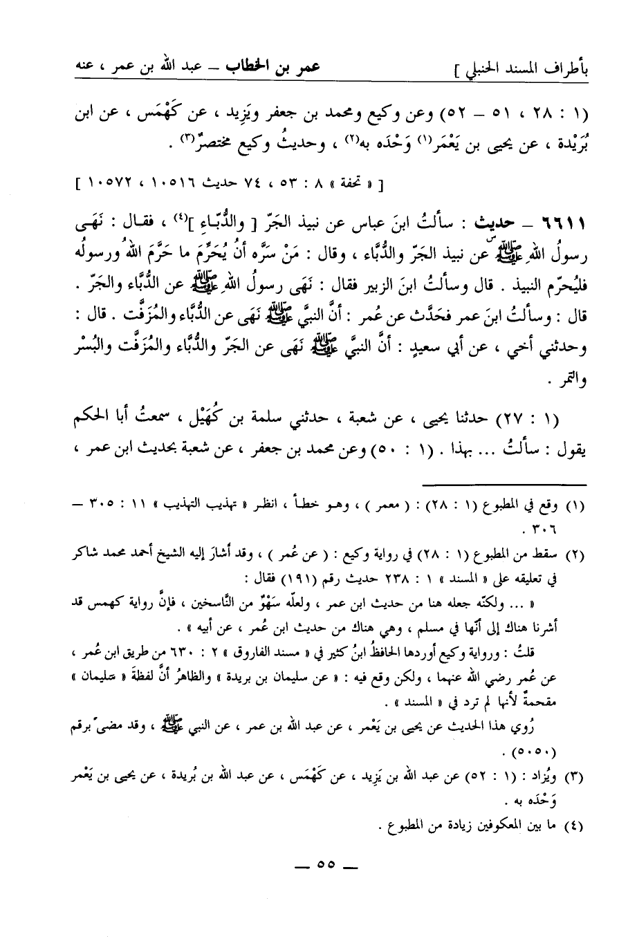 6611 -[س] حديث: سألت ابن عباس عن نبيذ الجر [والدباء] ، فقال: نهى رسول الله صَلَّى اللَّهُ عَلَيْهِ وَسَلَّمَ عن نبيذ الجر والدباء، وقال: من سره أن يحرم ما حرم الله ورسوله فليحرم النبيذ. قال وسألت ابن الزبير فقال: نهى رسول الله صَلَّى اللَّهُ عَلَيْهِ وَسَلَّمَ عن الدباء والجر. قال: وسألت ابن عمر فحدث عن عمر: أن النبي صَلَّى اللَّهُ عَلَيْهِ وَسَلَّمَ نهى عن الدباء والزفت. قال وحدثني أخي، عن أبي سعيد: أن النبي صَلَّى اللَّهُ عَلَيْهِ وَسَلَّمَ نهى عن الجر والدباء والمزفت والبسر والتمر. (1: 27) حدثنا يحيى، عن شعبة، حدثني سلمة بن كهيل، سمعت أبا الحكم يقول: سألت ... . بهذا. (1: 50) وعن محمد بن جعفر، عن شعبة بحديث ابن عمر، -[56]- عن أبيه به.