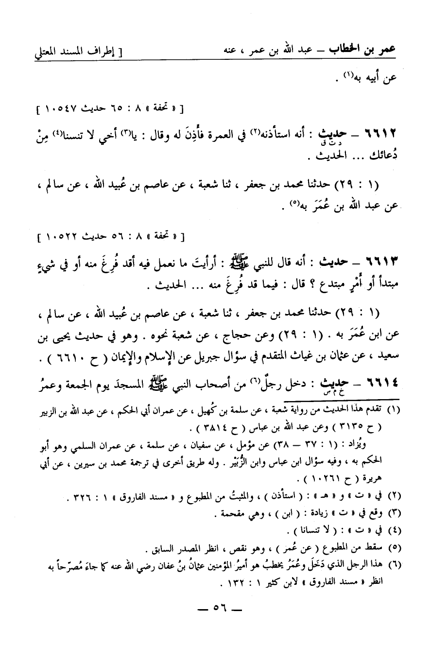 6612 -[د ت ق] حديث: أنه استأذنه في العمرة فأذن له وقال: يا أخي لا تنسنا من دعائك ... . الحديث. (1: 29) حدثنا محمد بن جعفر، ثنا شعبة، عن عاصم، بن عبيد الله، عن سالم، عن عبد الله بن عمر به.