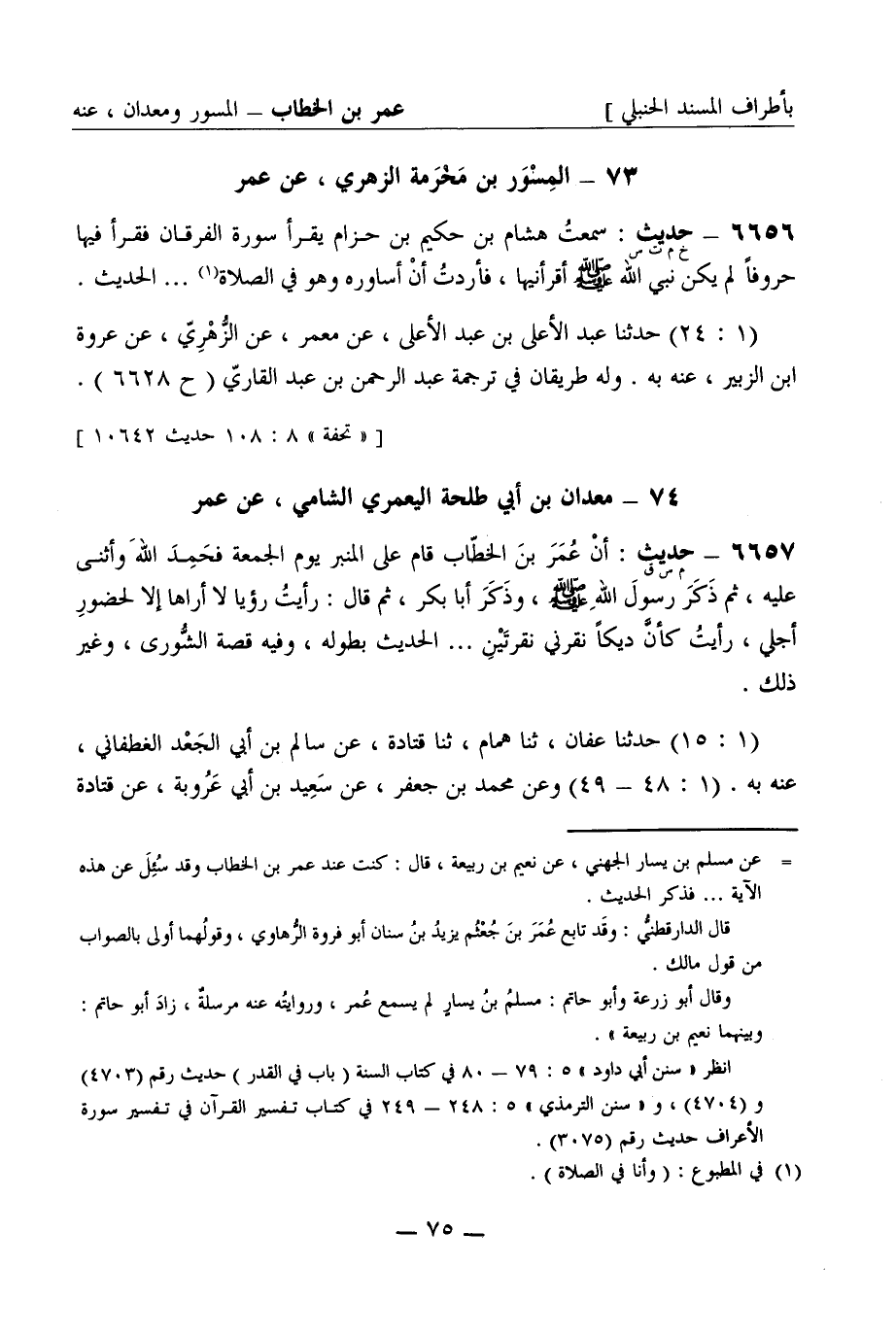 6656 - (ح م ت س) حديث: سمعت هشام بن حكيم بن حزام يقرأ سورة الفرقان فقرأ فيها حروفا لم يكن نبي الله صَلَّى اللَّهُ عَلَيْهِ وَسَلَّمَ أقرأنيها، فأردت أن أساوره وهو في الصلاة ... الحديث. (1: 24) حدثنا عبد الأعلى بن عبد الأعلى، عن معمر، عن الزهري، عن عروة بن الزبير، عنه به. وله طريقان في ترجمة عبد الرحمن بن عبد القاري (ح 6628) .