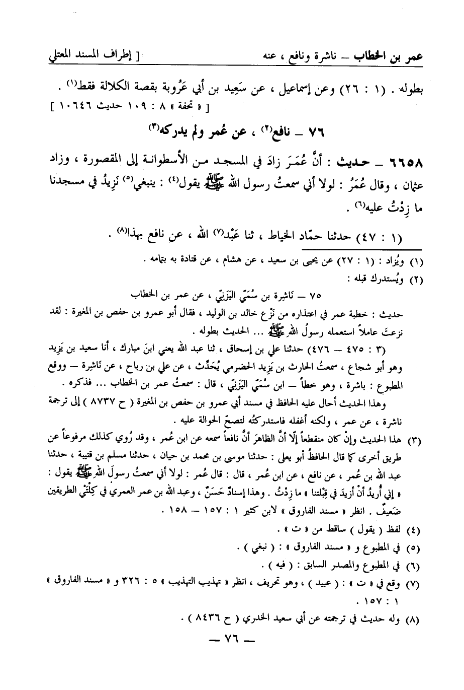 6658 - حديث: أن عمر زاد في المسجد من الأسطوانة إلى المقصورة، وزاد عثمان، وقال عمر: لولا أني سمعت رسول الله صَلَّى اللَّهُ عَلَيْهِ وَسَلَّمَ يقول: ينبغي نزيد في مسجدنا ما زدت عليه. (1: 47) حدثنا حماد الخياط، ثنا عبد الله، عن نافع بهذا.