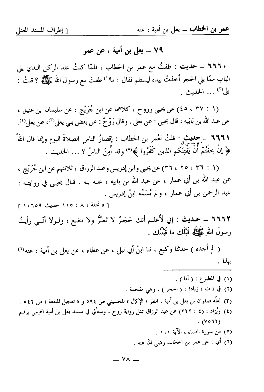 6660 - حديث: طفت مع عمر بن الخطاب، فلما كنت عند الركن الذي يلي الباب مما يلي الحجر أخذت بيده ليستلم فقال: ما طفت مع رسول الله صَلَّى اللَّهُ عَلَيْهِ وَسَلَّمَ؟ قلت: بلى ... الحديث. (1: 37، 45) عن يحيى وروح، كلاهما عن ابن جريج، عن سليمان عن عتيق، عن عبد الله بن بابيه، قال يحيى: عن يعلى. وقال روح: عن بعض بني يعلى، عن يعلى.