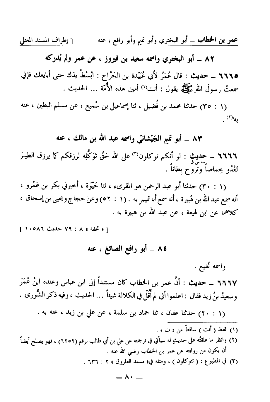 6666 -[ت س ق] حديث: لو أنكم توكلون على الله حق توكله لرزقكم كما يرزق الطير تغدو خماصا وتروح بطانا. (1: 30) حدثنا أبو عبد الرحمن هو المقرئ، ثنا حيوة، أخبرني بكر بن عمرو، أنه سمع عبد الله بن هبيرة، أنه سمع أبا تميم به. (1: 52) وعن حجاج ويحيى بن إسحاق، كلاهما عن ابن لهيعة، عن عبد الله بن هبيرة به.