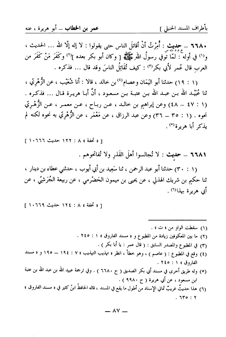 6680 -[خ م د ت س] حديث: أمرت أن أقاتل الناس حتى يقولوا: لا إله إلا الله ... الحديث، وفي أوله: لما توفي رسول الله صَلَّى اللَّهُ عَلَيْهِ وَسَلَّمَ [وكان أبو بكر بعده] وكفر من كفر من العرب قال عمر لأبي بكر: كيف تقاتل الناس وقد قال ... . فذكره. (1: 19) حدثنا أبو اليمان وعصام بن خالد، قالا: أنا شعيب، عن الزهري، ثنا عبيد الله بن عبد الله بن عتبة بن مسعود، أن أبا هريرة قال ... فذكره. (1: 47 - 48) وعن إبراهيم بن خالد، عن رباح، عن معمر، عن الزهري نحوه. (1: 35 - 36) وعن عبد الرزاق، عن معمر، عن الزهري به نحوه لكنه لم يذكر أبا هريرة.